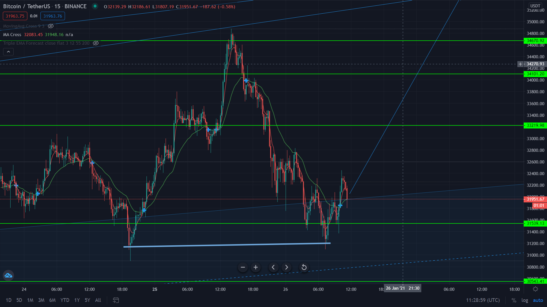 Bitcoin entered the lower channel but could not stay and quickly exited, this is a reversal and mean BTC is going to go up towards the 34k zone when it dropped from and there a decision will be made if it goes higher or drops back down again