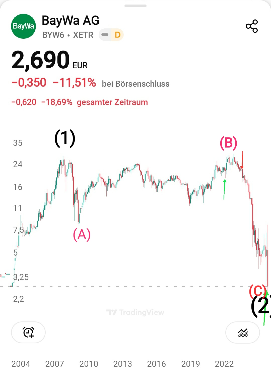 Auch wenn auf Sicht von 3 Jahren die Insolvenz Wahrscheinlichkeit bei ca. 70% liegt, so ist bei entsprechendem Moneymanagement das Risiko kontrollierbar. Im idealfall knallt der Kurs bis zum Jahresende auf 7-8€ wieder zurück und bildet eine V-Formation, welche dann den Grundstein für weitere Kursanstiege bis auf 20-25 € legt - entweder als 1 einer (3) oder als x-Wave einer aufwärts Korrektur.