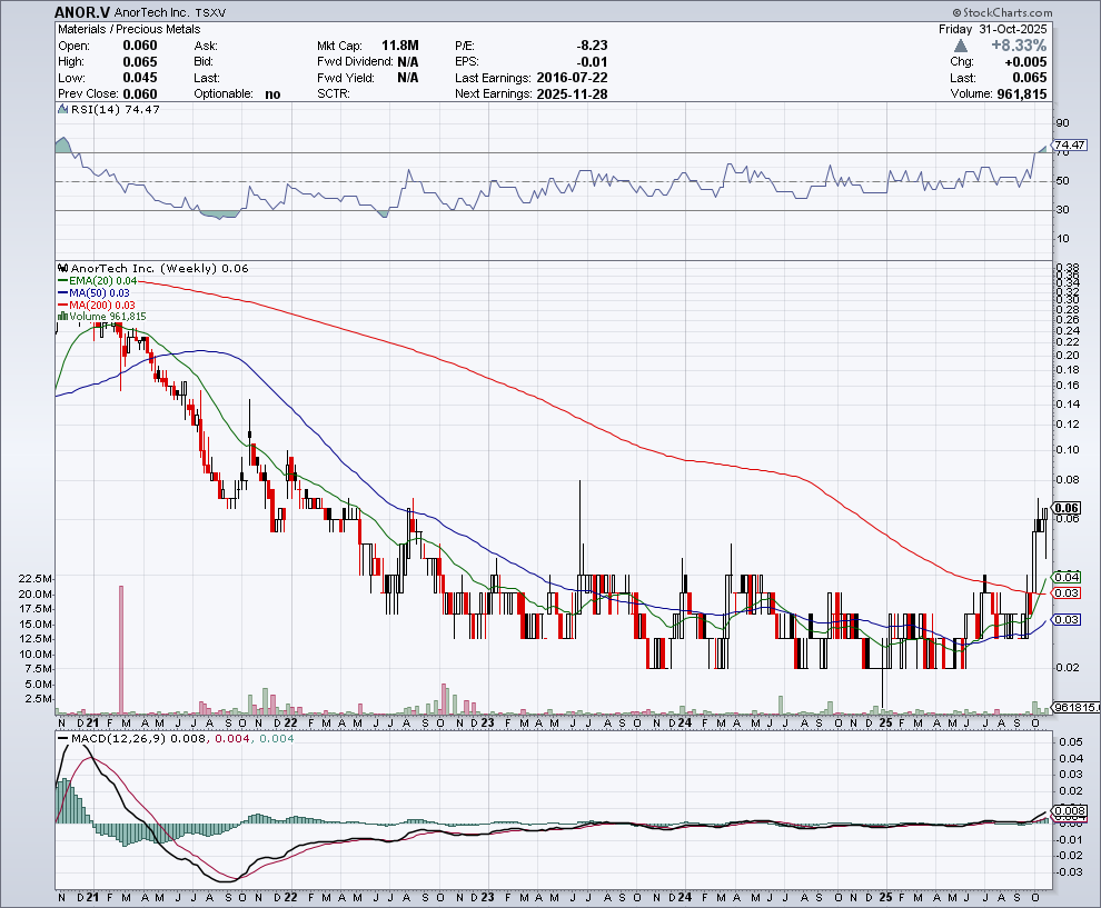 Die Aktie von Mineral Hill Industries hat im zurückliegenden Monat am 24.10.2025 ein historisch zu wertendes Volumensignal ausgebildet. In nur einer Handelssitzung wechselten dabei mehr als 1.3 Millionen Aktien in Kanada und Frankfurt den Besitzer. Bemerkenswert daran ist, dass dieser "Belastungstest" durch den unbekannten vom Markt bereitwillig aufgefangen wurde und die zwischenzeitlichen Kursverluste komplett wieder neutralisiert wurden. Auch hier signalisieren die gleitenden Durchschnitte einen Käufermarkt, nachdem die Aktie gestern zum Monatsschluss die 200 Tagelinie ebenfalls zum Monatsschlusskurs überwindet. Der Markt hat damit den Kurseinbruch nach dem Wechsel an der Führungsspitze des Unternehmens im letzten Jahr komplett überwunden, zumal Instant Finance aus der Schweiz als neuer Mehrheitsaktionär am 24.10.2025 erstmals in Form eines Insider Block Kaufs sich selbst am Markt engagiert und damit ein veritables Signal an den Markt sendet, dass viel Unsicherheit aus der Aktie nehmen dürfte. Noch ist unklar, was im Hintergrund für ein Geschäftsmodell eingefädelt wird, aber das Marktverhalten der letzten Wochen und Monate, bei dem im Hintergrund bereits eine unbekannte Adresse immer wieder als Käufer - abseits des Retail Anlegers - in Erscheinung trat - ist dabei subtil im Orderflow wahrnehmbar.