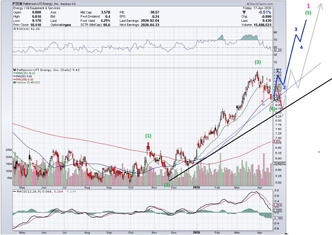 vor fast 9 Monaten stellte ich an dieser Stelle die Aktie von Patterson Energy erstmals als interessanten Longplay für einen langfristig angelegten Positionstrade vor. Damals notierte die Aktie unter 6 USD nur um die klassischen Elliotwellen lehrbuchmässig abzuarbeiten. Bei Kursen knapp unter 11 USD riet ich auf wallstreetonline vor ca. 4 Wochen zum Ausstieg, da der Count der grünen 3 im Chart fertig erschien. Eine 20 Prozent Korrektur sollte bis in den April hinein erfolgen. Die geschah nun mehr im weiteren Verlauf in einer mutmasslichen a-b-c Bewegung im Rahmen einer 38.2-log Fibo Korrektur in klassischer Art und Weise. Folgt man der Rule of Alternation so dürfte die Welle 4 damit fertig gestellt sein, da wir bei der Welle 2 im Oktober 2025 eine tiefe Korrektur hatten ehe die eigentliche grüne 3 ihren lehrbuchmässigen Verlauf nahm.
