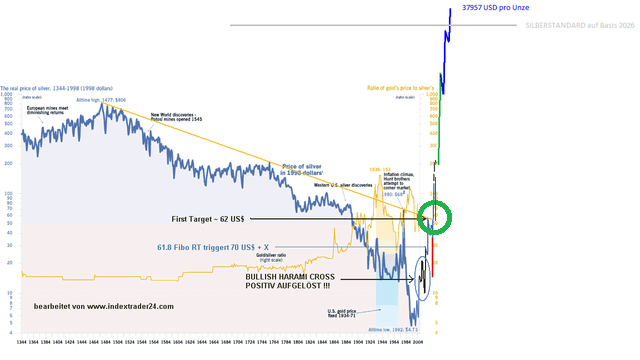 Silber ist und bleibt langfristig fundamental unterbewertet. Dies zeigt auch der signifikante Ausbruch über die zweimal torpedierte 50 USD Marke. Charttechnisch muss man die gestrige Kursbewegung in den langfristigen Kontext einordnen. Denn der Bruch des rund 549 Jahre langen Abwärtstrendes im letzten Jahr - ausgehend von 807 USD je Unze Silber im Jahre 1477 - inflationsbereinigt dürfte das Korrelat von 807 USD je Unze inzwischen bei umgerechnet 3100 USD je Unze liegen, sofern mein den USA eine jährliche Inflationsrate im Fibonaccimassstab modellhaft mit 6.18% unterstellt.