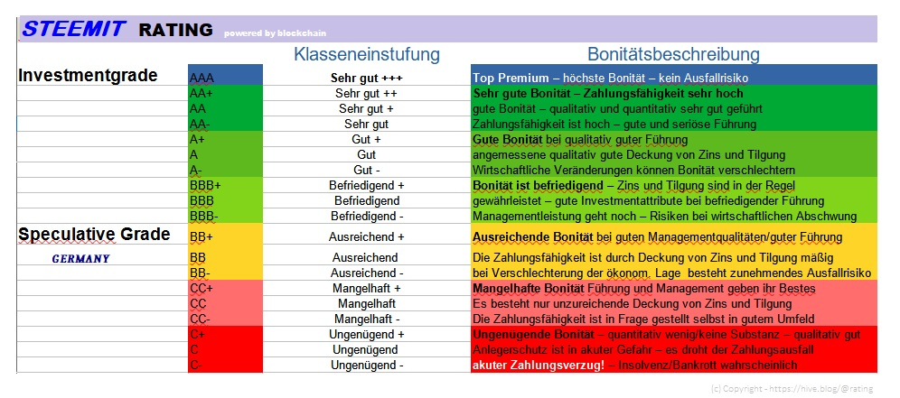Eine Übersicht über die Einteilung der Bonität bei @steemrating auf der Steem Blockchain ist in der folgenden Tabelle dargestellt: