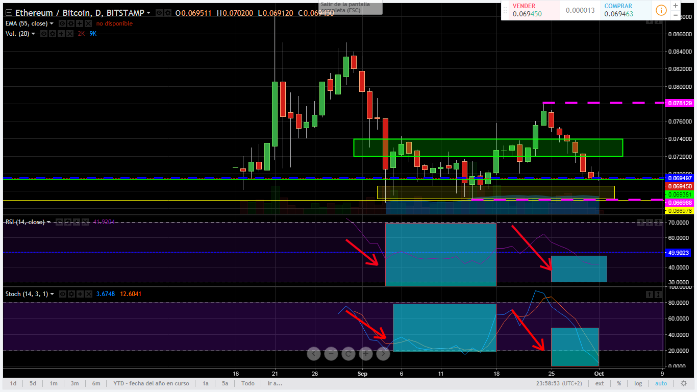 Los osciladores RSI y Estocástico están los dos en sobre venta, estamos en un soporte de los 6.900.000 - 7.000.000 satoshis el cual se mantiene.