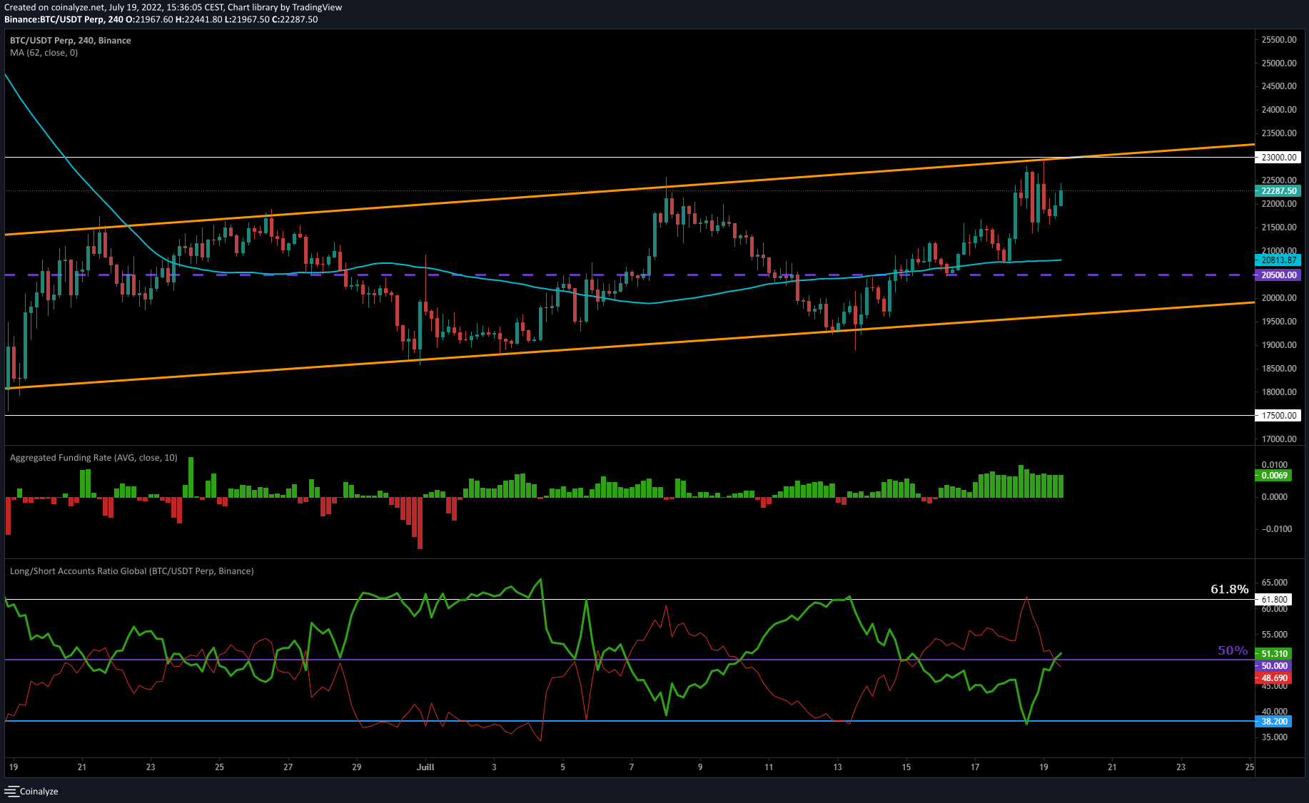 - For the past month, BTC has been in an H4 bullish channel with higher lows and higher highs and low volatility between 17.5K and 23K