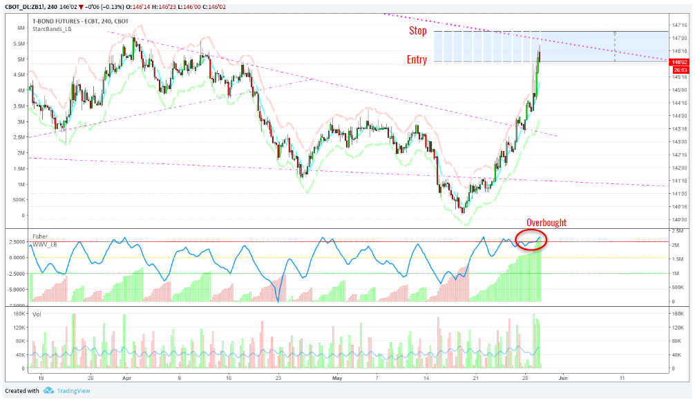 Shorting ZB futures here at 146'03 with a stop at 147'05. After a significant run-up today, I'm fading the action in bonds. For those of you unfamiliar with futures, ZB is the trading symbol for the 30-year bonds. The minimum movement in a futures contract is called a tick, and for ZB each tick is $31.25. There are 32 ticks in one ZB point, which equals $1000 per point.