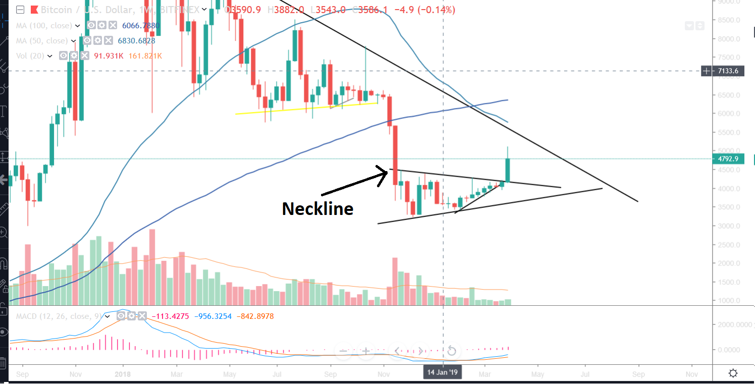 What happened today with the bitcoin price pump was very interesting. On the one hand, many indicators were showing that they were too high and they were primed for a pullback. On the other hand, bitcoin had broken over the neckline that was holding the price down the last few months, and sat above it for almost a day or so. This move was telling us that now that the price has briefly consolidated above the neckline, it is primed for a move up, just as we have seen.
