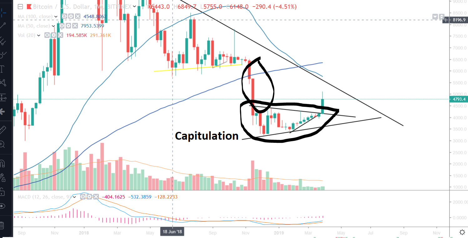 It is my opinion that from the 18th of December 2017 until the 5th of November 2018 bitcoin was in a bear trend. From the 12th of November until today, I believe we were in the phase of Capitulation. There was a lot of despair in the crypto market during the capitulation phase, I sure felt it and the prices of many alt coins reflected this also.