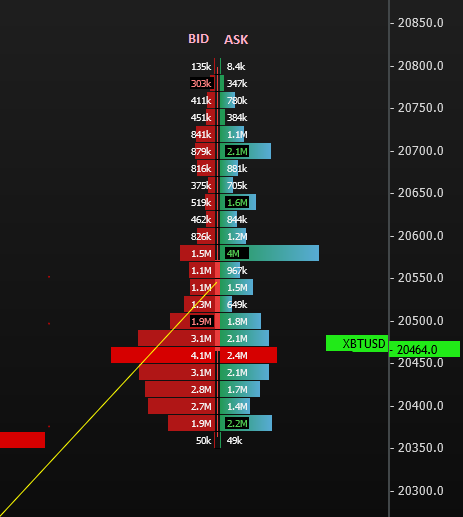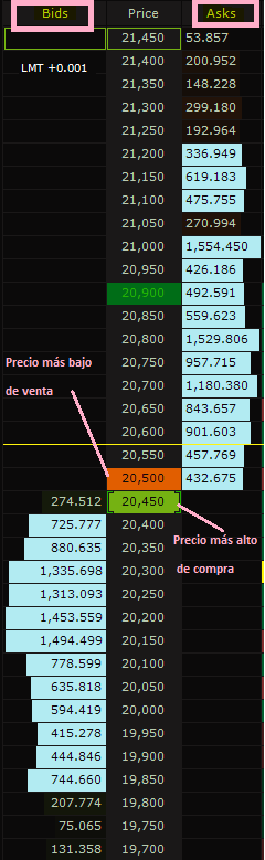 En la columna del centro, en el libro de ordenes, se observan los precios BID-ASK en los diferentes niveles de la profundidad de mercado.