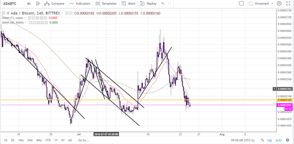 Today we want to look at adabtc and adausd, the bull run of btc we often want to push in out tether, tusd or usd into the market and not just move our Bitcoin from A to B, some investors will start to take BTC profit and move it into alts. ADABTC looking bearish by touching its previous support, the strength of the announcement that coinbase will add ada is gone for now, on the other side Cardano to USD has set new support high giving it a bullish sentiment, over all rating, neutral