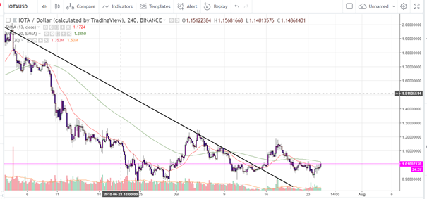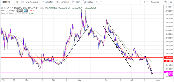 IOTA is trading at December lows against Bitcoin, resistance hasn’t been broken yet.