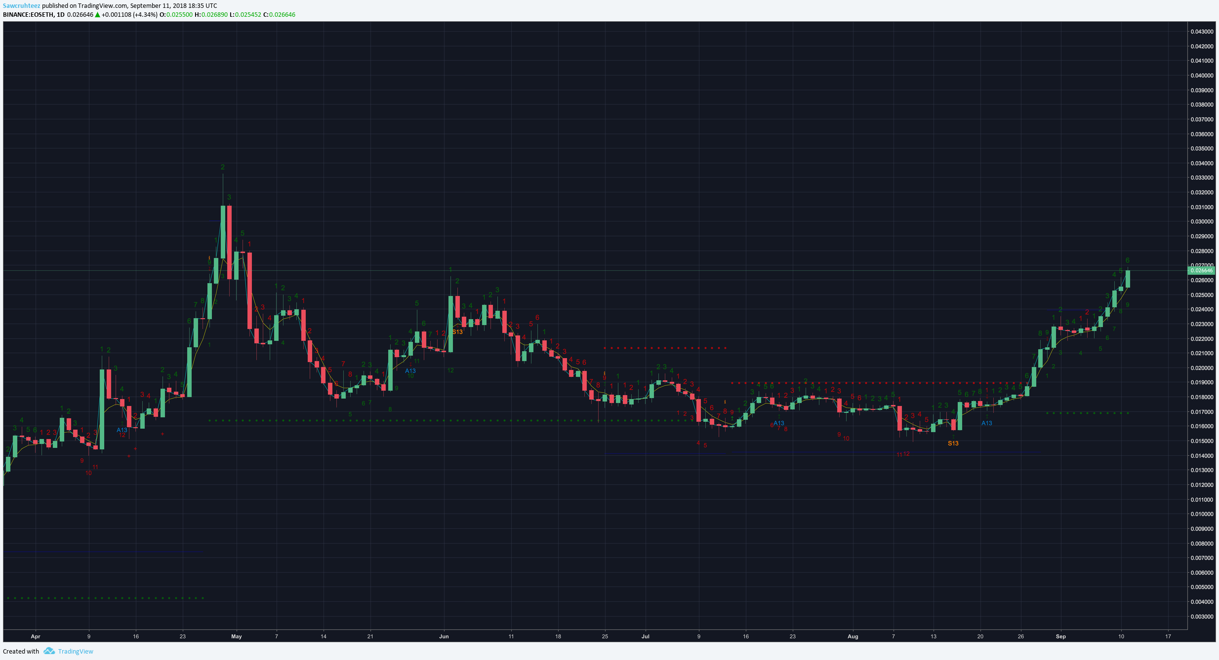 Shorting EOS:ETH seems like an even better bet. Currently on a green 6 which indicates three more days to the upside. That lines up perfectly with ETH falling into support and should be around the time EOS:BTC breaks down the crucial trend support.