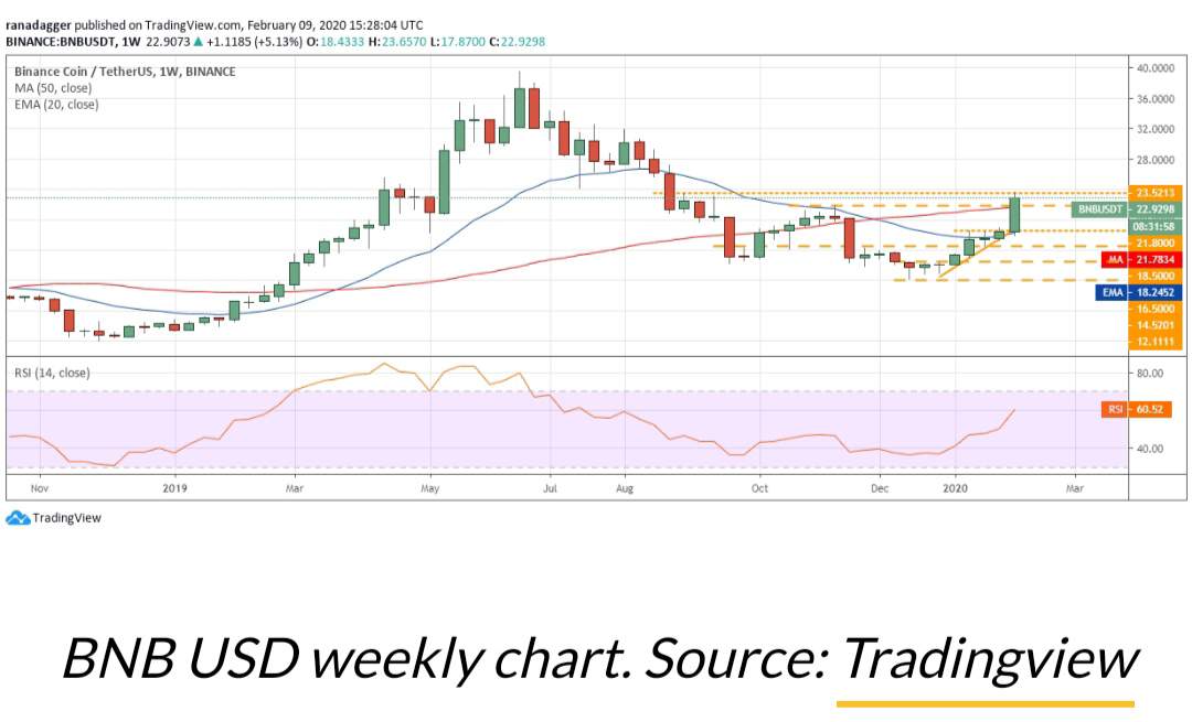 The sharp trend this week exceeded resistance at $ 18.50 and $ 21.80. This shows that the pair BNB / USD gained momentum. The price reached $ 23.5213, which seems to be serious resistance. If the price falls from the current level, but does not take up much space, you will most likely break above $ 23.5213. Outside this level, a new uptrend begins. The first level that you should pay attention to is 32$.