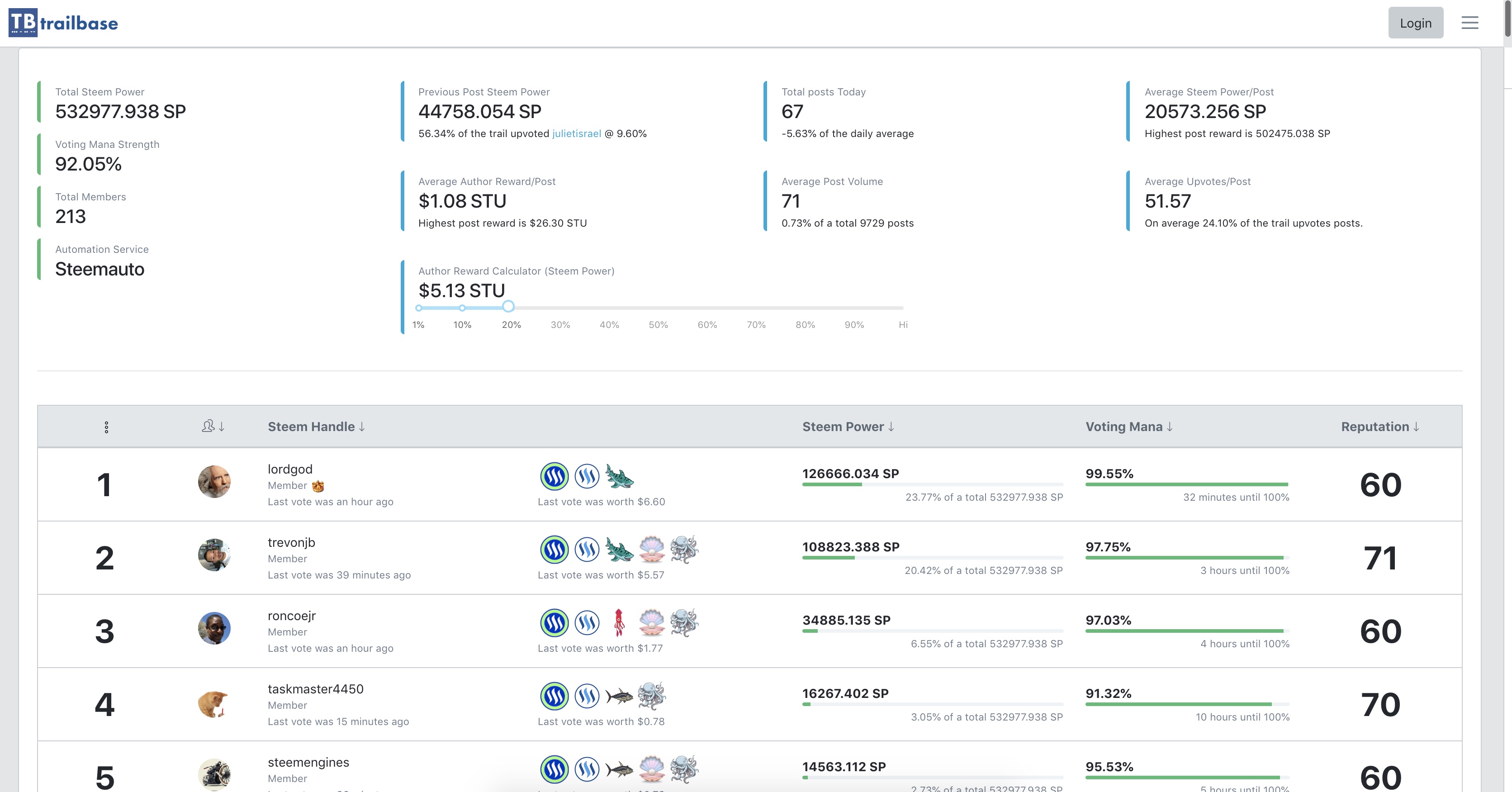 The last time I did an update on the curation trail project a few weeks ago we were just crossing our 500,000 total steem power milestone. We are now crossing 533,000 total steem power following the trail with 213 members following and averaging about 71 upvotes a day. If you would like to be upvoted by our trail you can read about how here: https://steemit.com/steemauto/@trevonjb/how-does-my-curation-trail-work