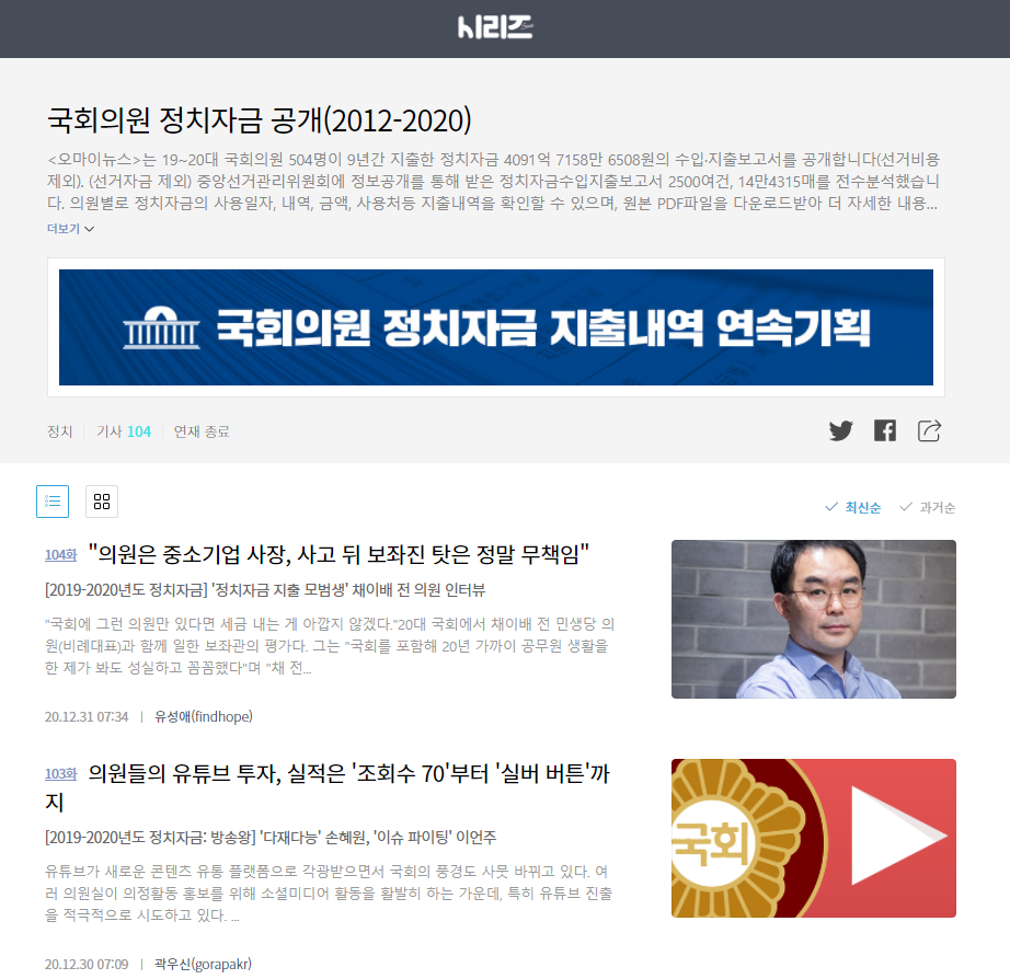그동안 오마이뉴스가 국회의원들의 정치자금 지출 내역에 주목하여 심도 깊은 기획 기사들을 수년 간 이어온 바 있는데요, (기사 링크) 앞으로는 더 많은 시민과 언론들이 정치자금 감시에 나서는 모습을 볼 수 있으리라 생각합니다. ^^