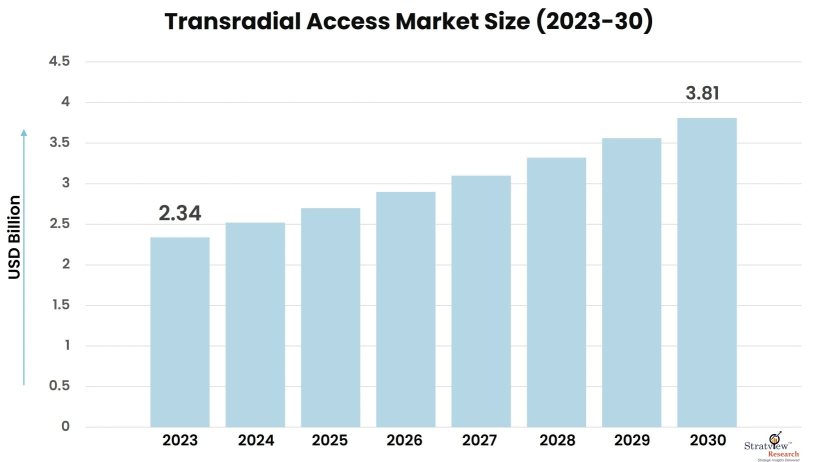 According to Stratview Research, the transradial access market was estimated at USD 2.34 billion in 2023 and is likely to grow at a CAGR of 7.17% during 2024-2030 to reach USD 3.81 billion in 2030.