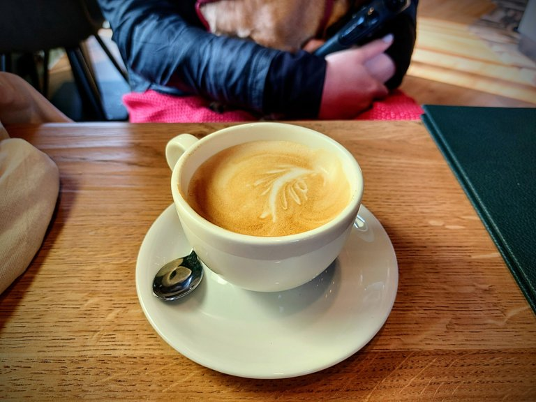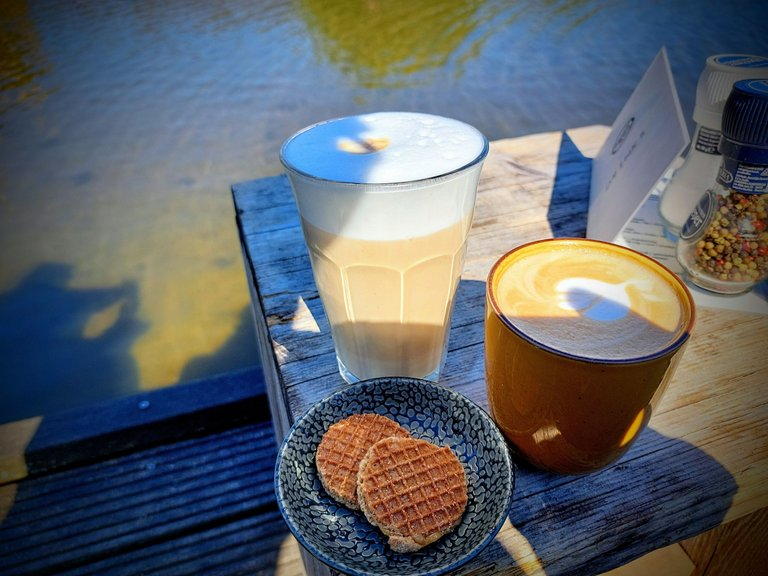 I started taking photos of some of our breakfasts and morning coffee adventures during our trip to the Netherlands. The breakfasts were simple but delicious and the coffees were just so pretty and well done that I couldn't help but snap a few photos. The first ones were taken in the city of Zaandam where we had lunch before touring the city. I got a cappuccino (above) and my wife got a flat white (below).