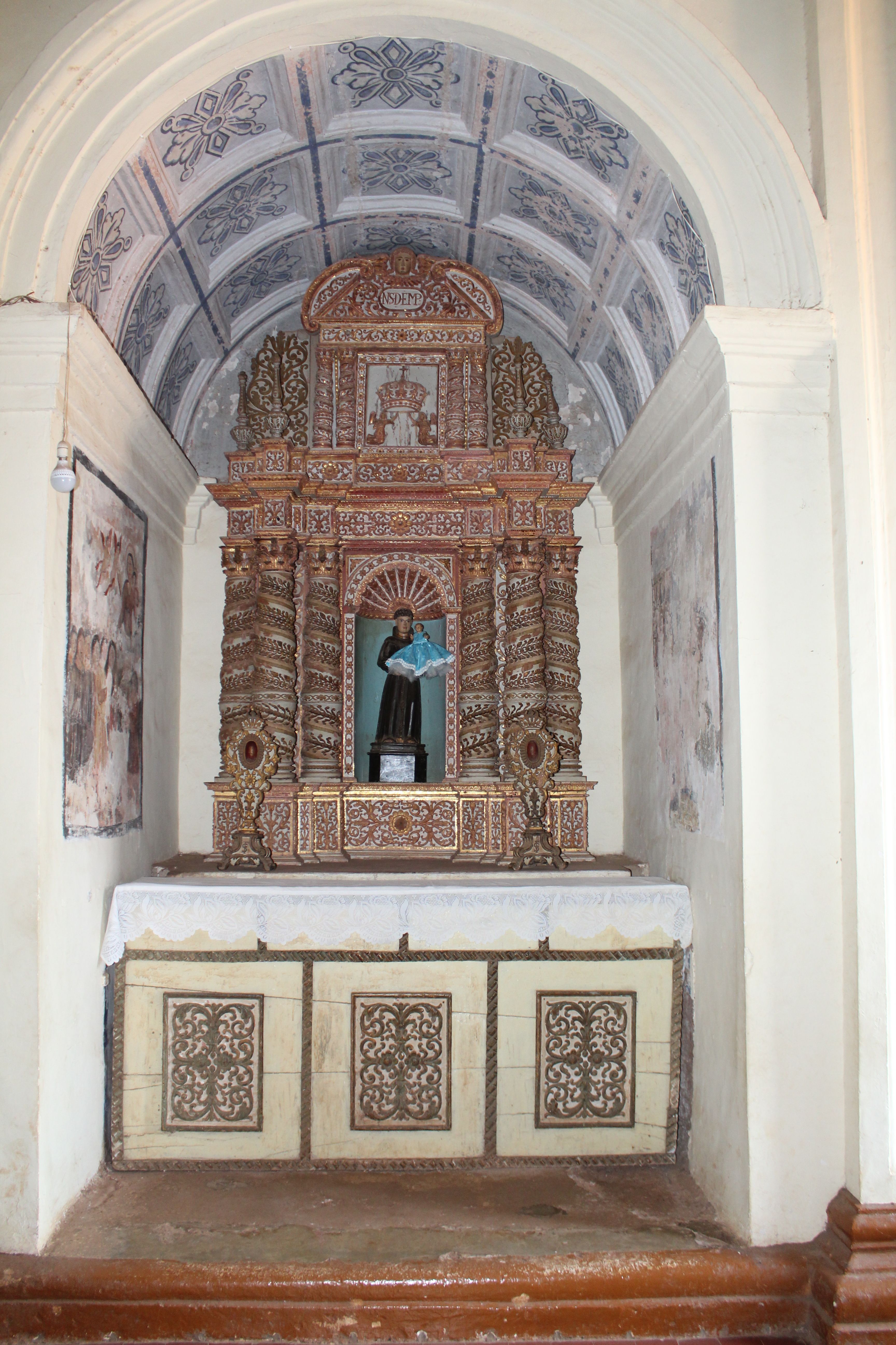 I reached the site at 11 am and walked in with few candles. From outside the church looks a massive yet straightforward structure with a big open space containing a church and garden on three sides of the church. The church is more than 410 years old, so I did not expect much from the interior. I entered the church, and the interior and other artworks were phenomenal and were depicting a different picture of the site as opposed to the outer structure. On seeing the freshness, I felt like the artwork was very new. But when I read more about it, I found most of the artwork was done in the seventeenth century only. I liked the artwork on the pillar the most which had the beautiful carvings and golden in color. This type of artwork is known as fresco. Fresco is a painting technique performed upon a freshly laid, or wet lime plaster.