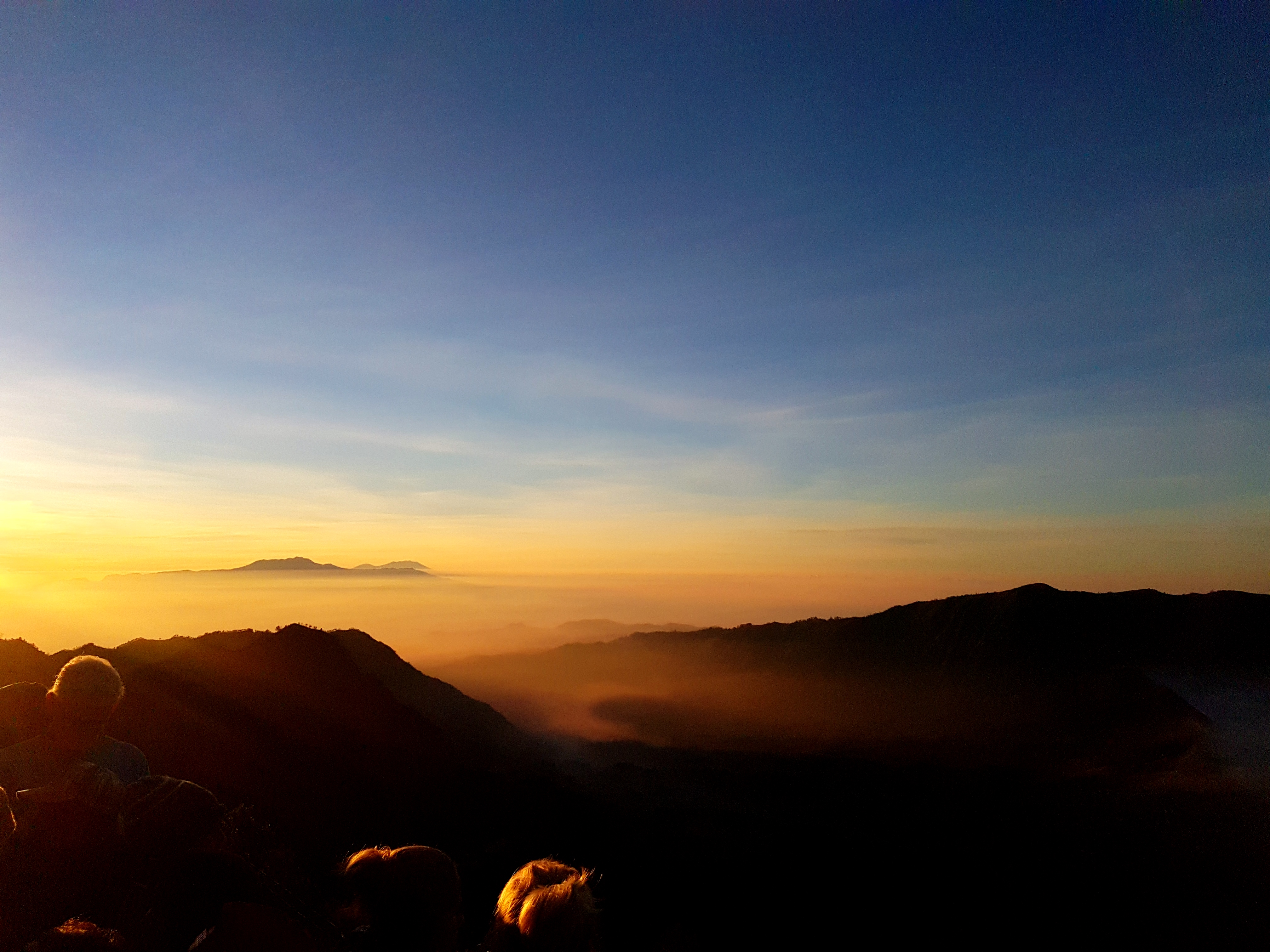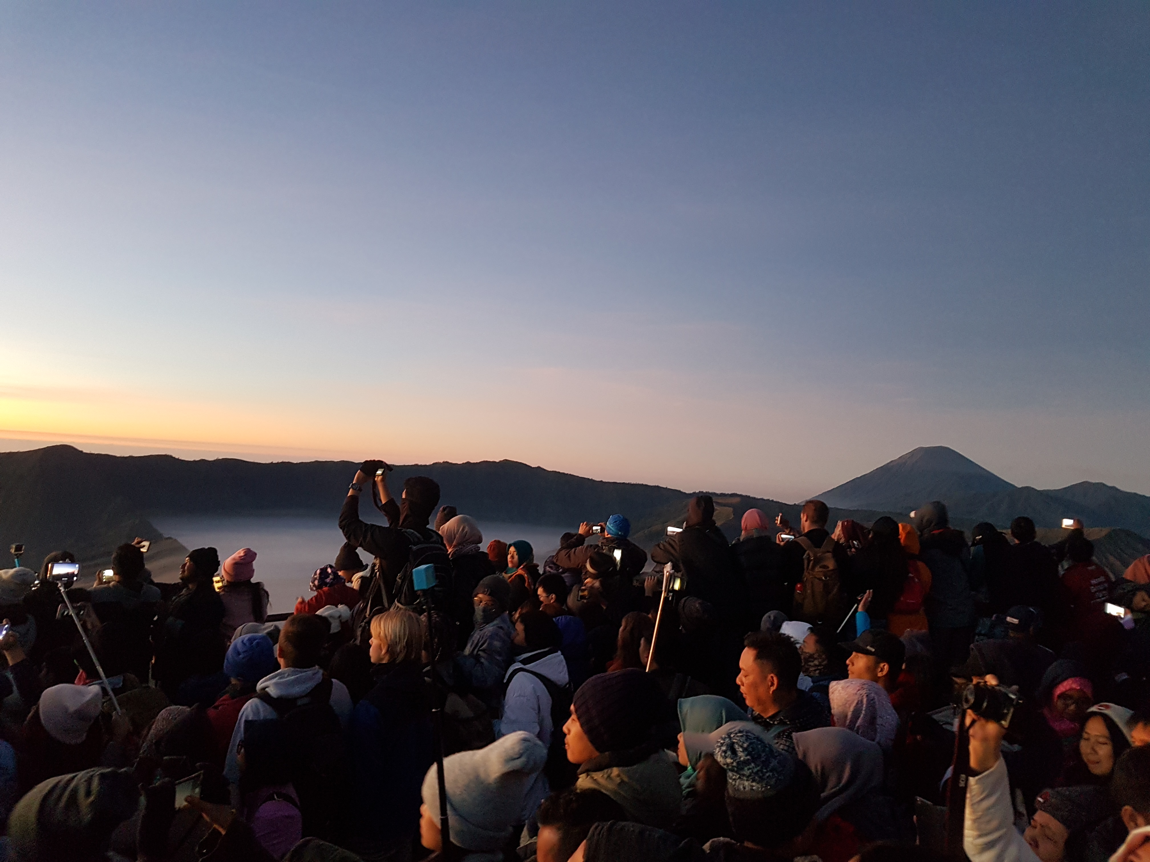 Ketika semua telah selesai kami menaiki jeep menuju lokasi, setibanya dilokasi kami harus mendaki sekitar 100 meter ke atas cukup terasa berat pada malam itu. Namun perjuangan itu tidak sia-sia begitu tiba kami melihat banyak wisatawan yang menanti sunrise baik wisatawan dalam negeri maupun luar negeri. Saat menanti sunrise kami menunggu mulai dari jam 00.00 sd 04.00 wib semua wisatawan datang dan duduk lebih awal agar berada pada posisi strategis untuk melihat sunrise. Proses menunggu sunrise terbilang sangat lama, perasaan butuh kehangatan dan menahan air kecil serta menghadapi dinginnya malam membuat kami mendekati titik jenuh menghadapi suhu (-celcius) diatas sini. Hingga perjuangan mendekati puncaknya kami berhasil melewati cobaan ini dan menyaksikan secara langsung sunrise dari kawasan Bromo.