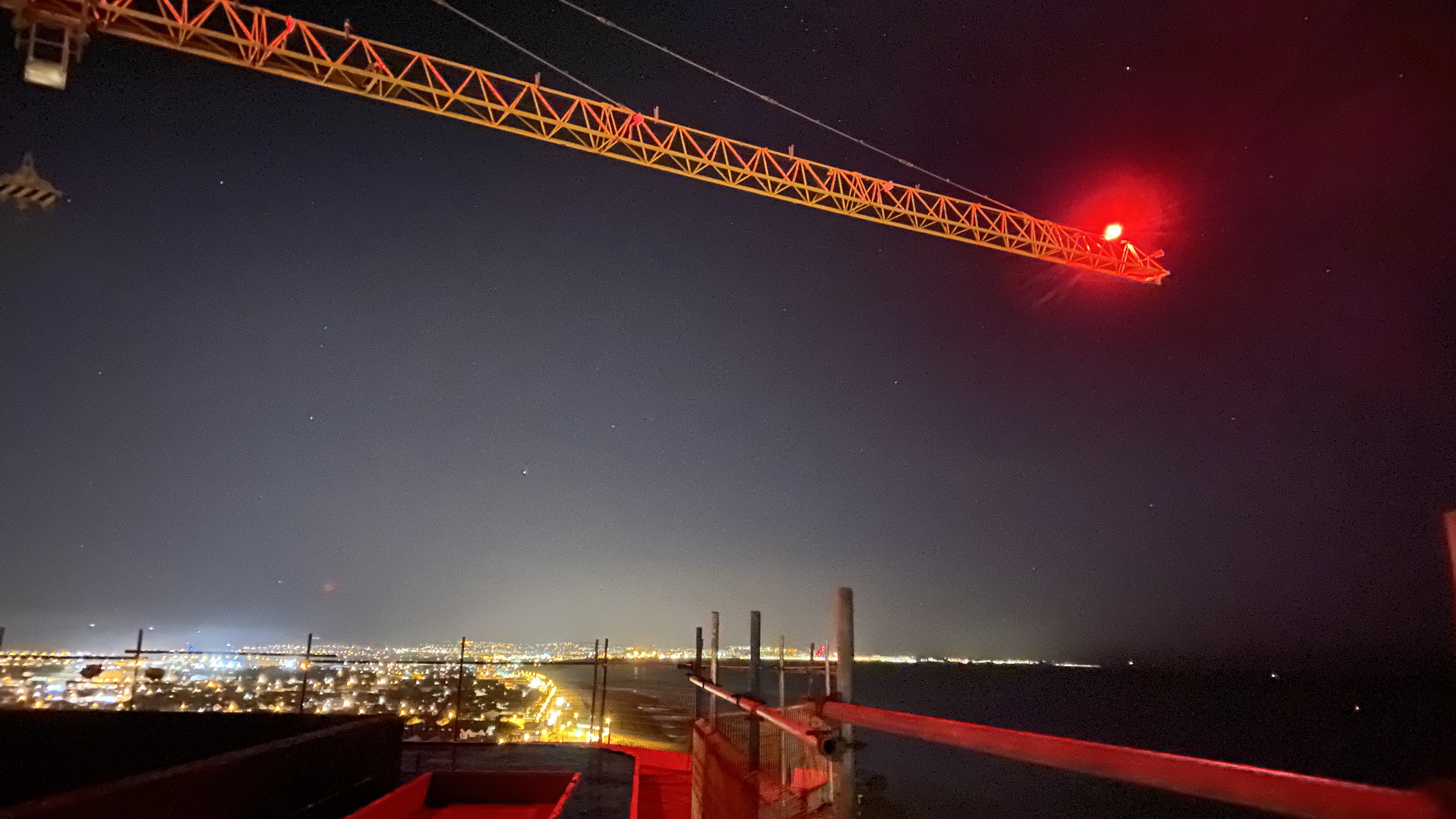 This particular crane did have a security guard, but he stayed in his cabin. With the lights on inside and the window open, his visibility was pretty limited. The site was close to a hospital, so constant sirens gave us plenty of cover, allowing us to move up the crane quickly with all that background noise.