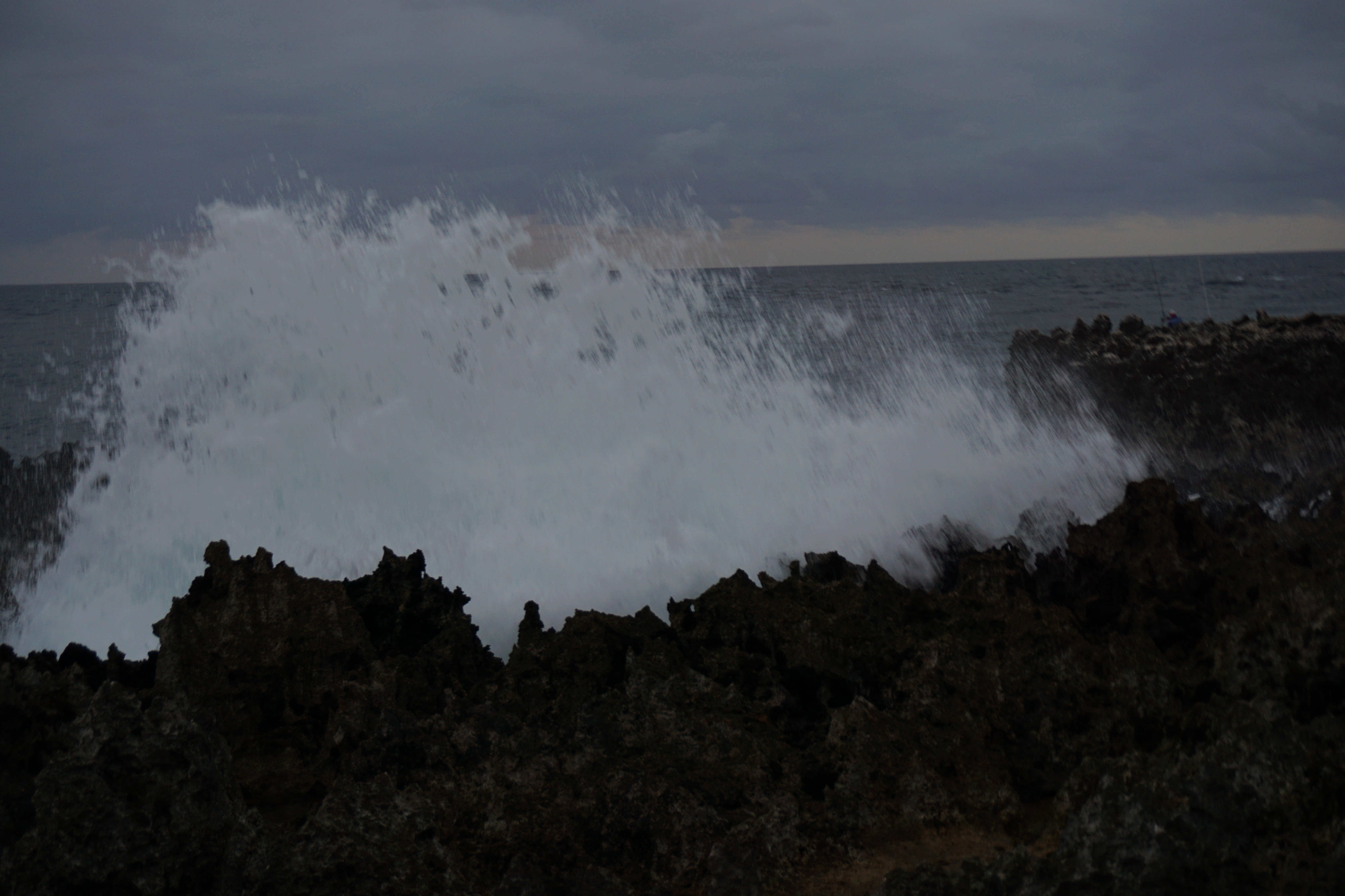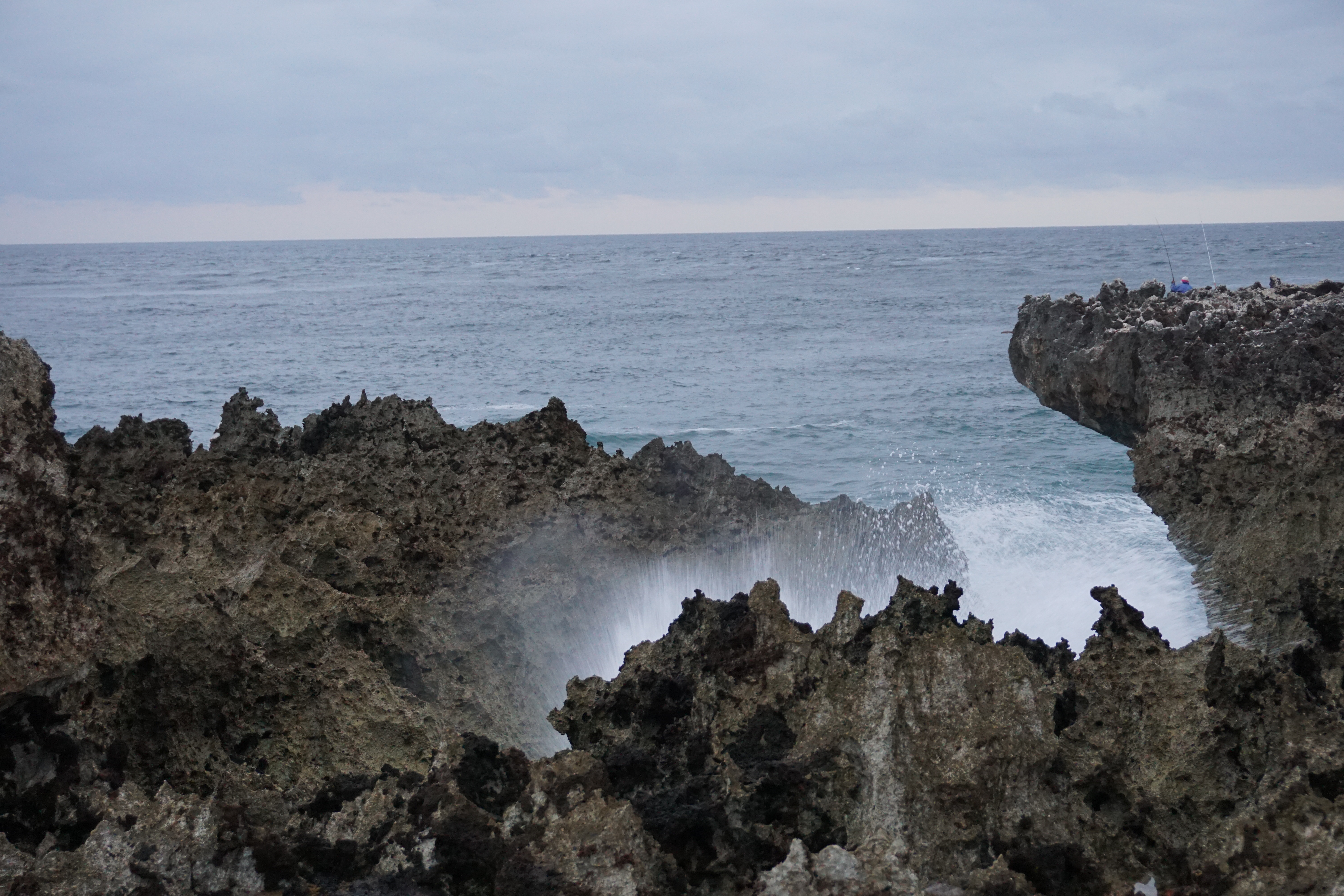 It blasts the water into the rock channels and blows it into the air!