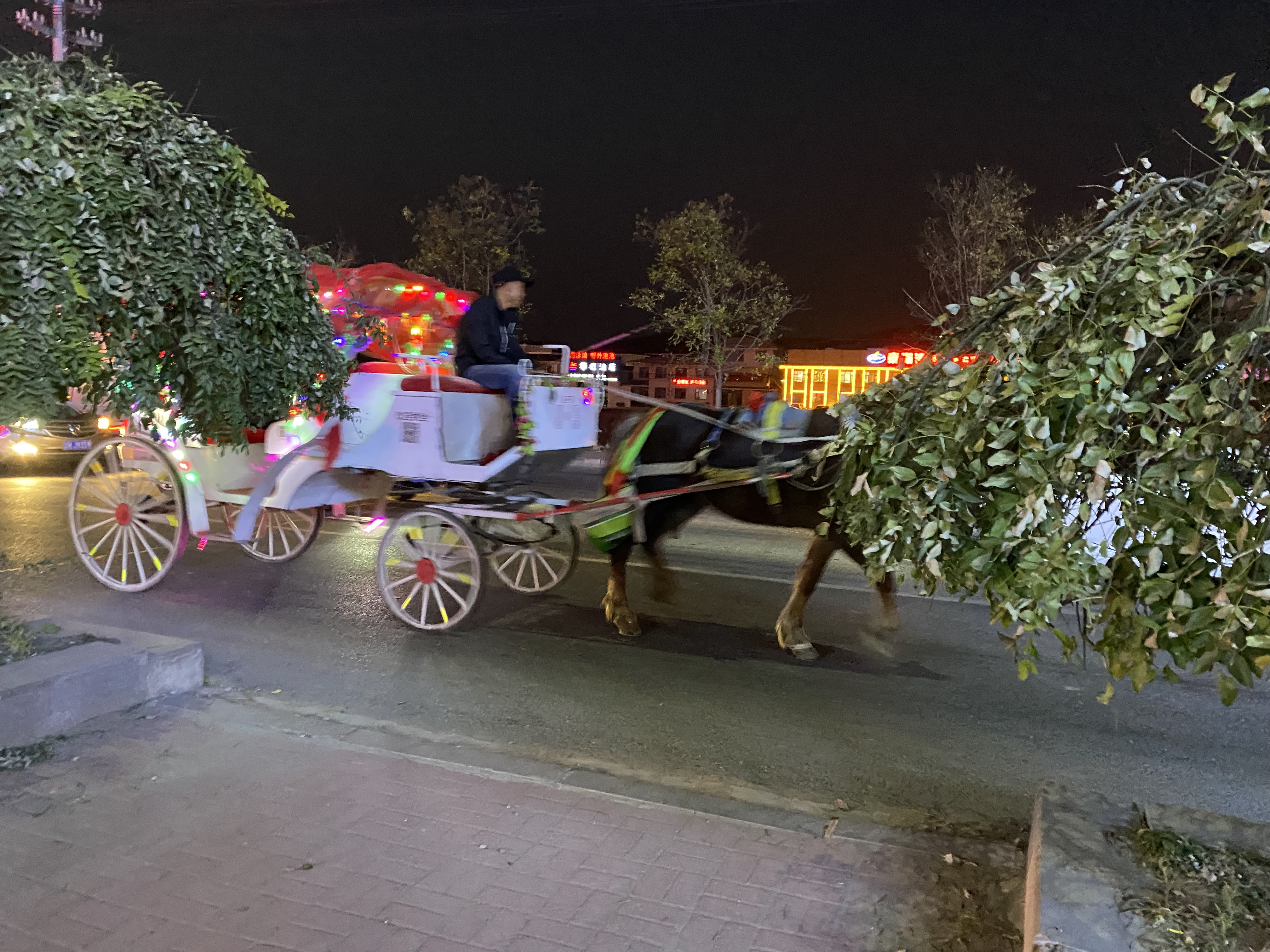 一行人,溜达着逛夜景,偶尔马路上还会有装饰漂亮的马车一闪而过,游客们可以体验一下,试驾马车的感觉,马车后面的车厢全部用彩色的灯装饰,还真的漂亮呢!
