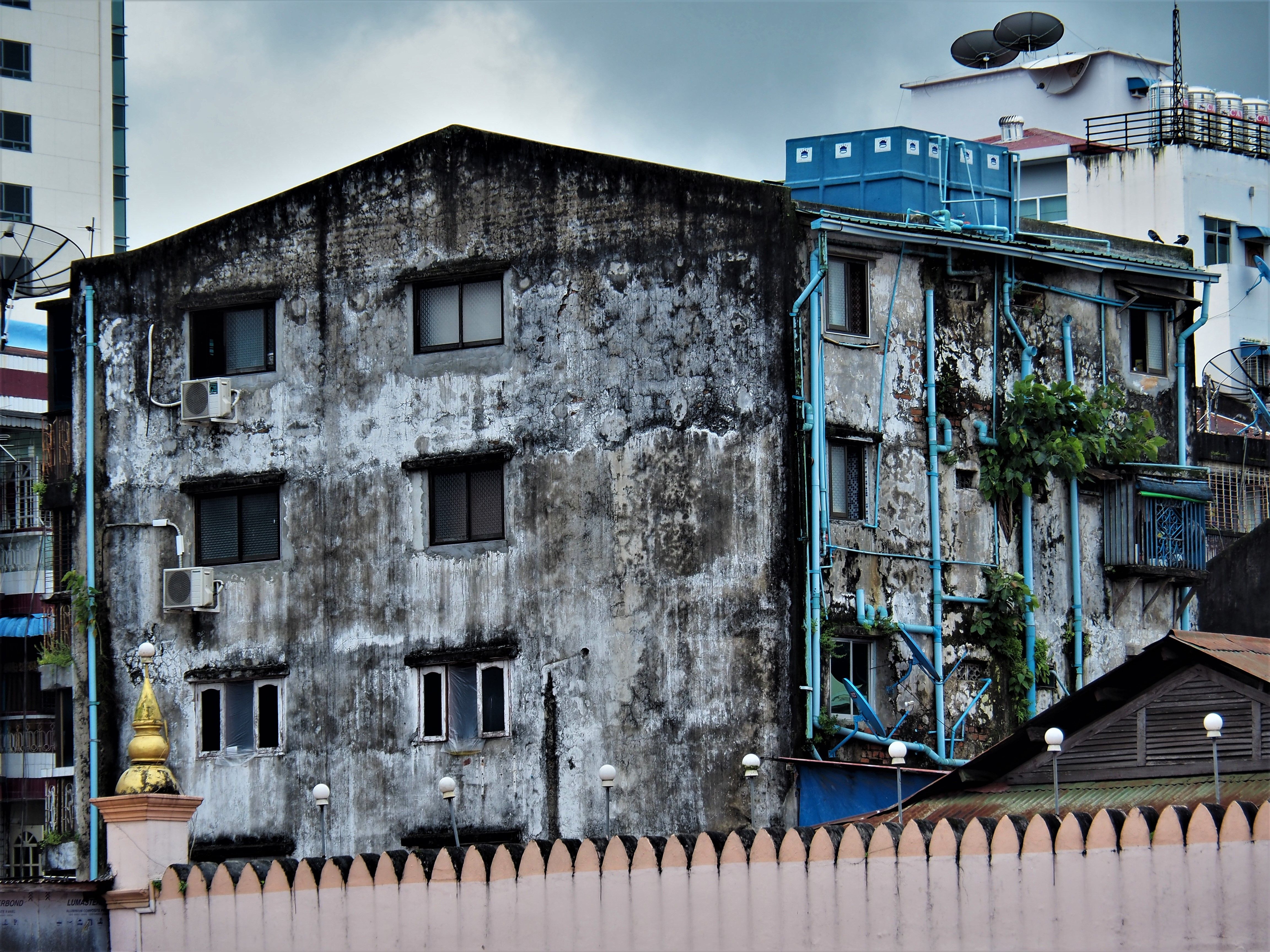 Many buildings in the city had crumbling plaster from their walls and plants growing from the cracks