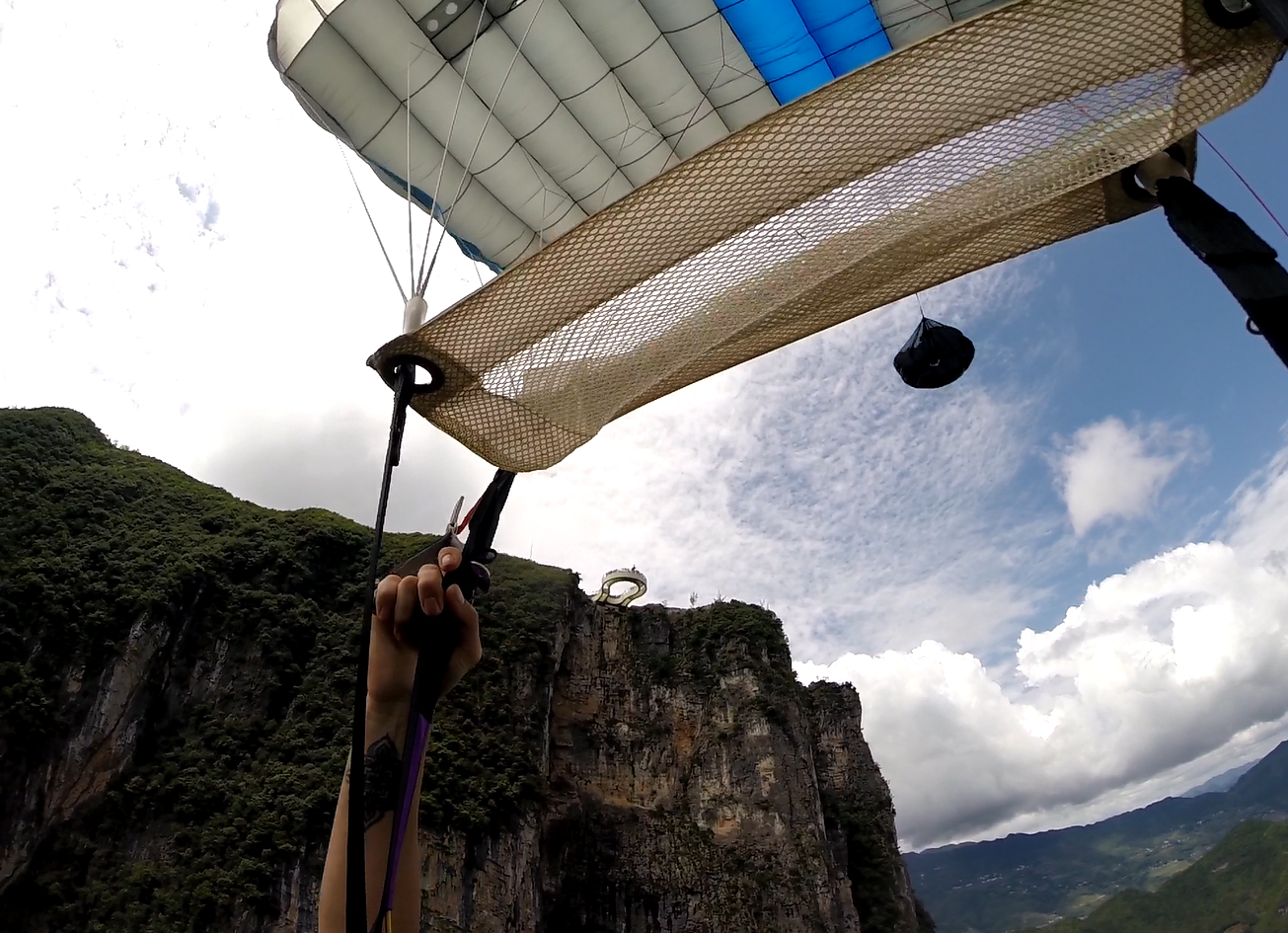 I was given the go ahead and I ran and jumped off. As my parachute was opening the wind shifted the pack job and I ended up opening facing the wall completely with a 180 degree off heading opening. The worst possible direction for an opening. I was immediately super close to the wall as I pulled down on the risers to stop my forward motion and back up before letting one up to turn around, nearly clipping the wall and the foliage growing out of it. The wide angle on my head mounted camera made it look closer than it was but it was terrifying nonetheless. After safely turning around I flew for several minutes under canopy through the beautiful canyon, trying to ignore the desire to just be on the ground and instead enjoy the epic beauty surrounding me. I landed in the target on the floating platform below and was greeted with open arms by my friends.