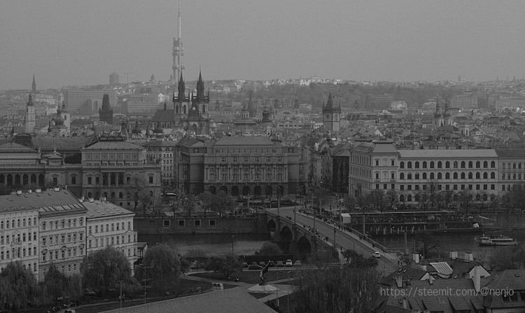 In this B&W photo can be seen a view of Prague and it shows all the different architectonic styles. You can see the Gothic towers of Clock Tower, Church of Our Lady before Týn, and the Baroque towers of St. Nicholas Church. At the background of the image, you can see the modern TV tower, which stands above the traditional city skyline.