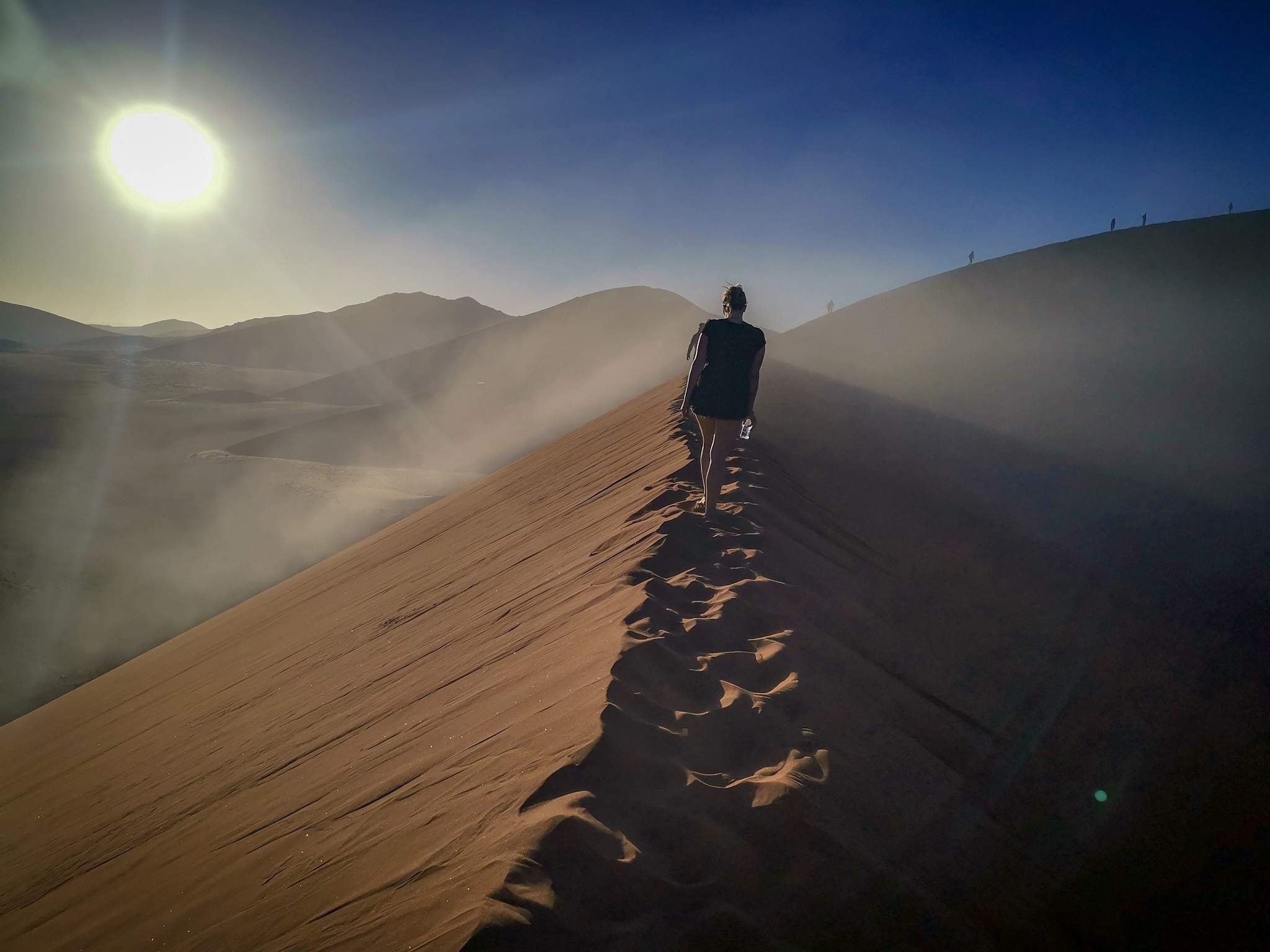 Climbing Dune 45 at sunrise in the Namibian desert was a morning to remember! Once we got to the top we where about 170 m high. It was amazing to climb up the sand dune through the morning fog.