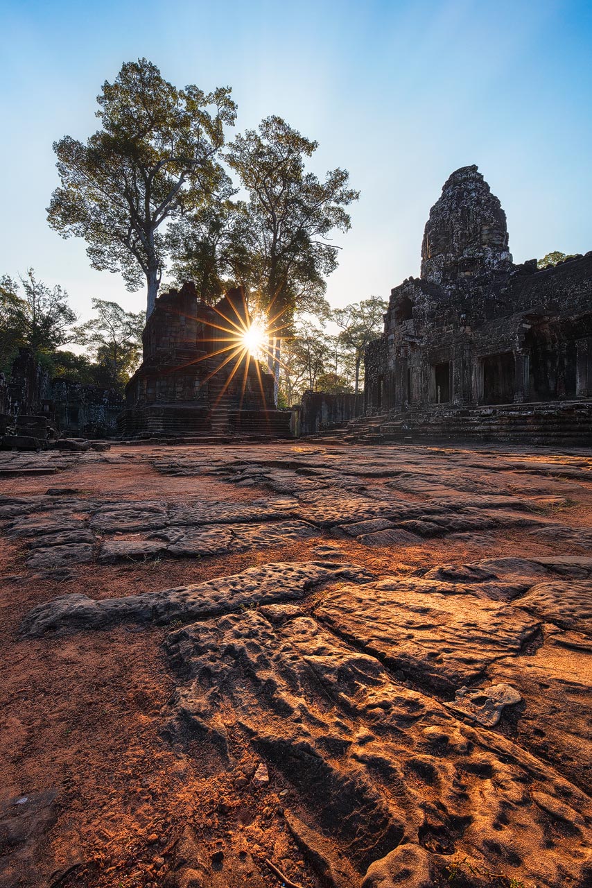 A sunrise photo of the Bayon temple, one of the many ruins within Angkor. This place is great to explore, but best come early in the morning while most of the tourists are still visiting Angkor Wat. In the morning you can really enjoy the area.