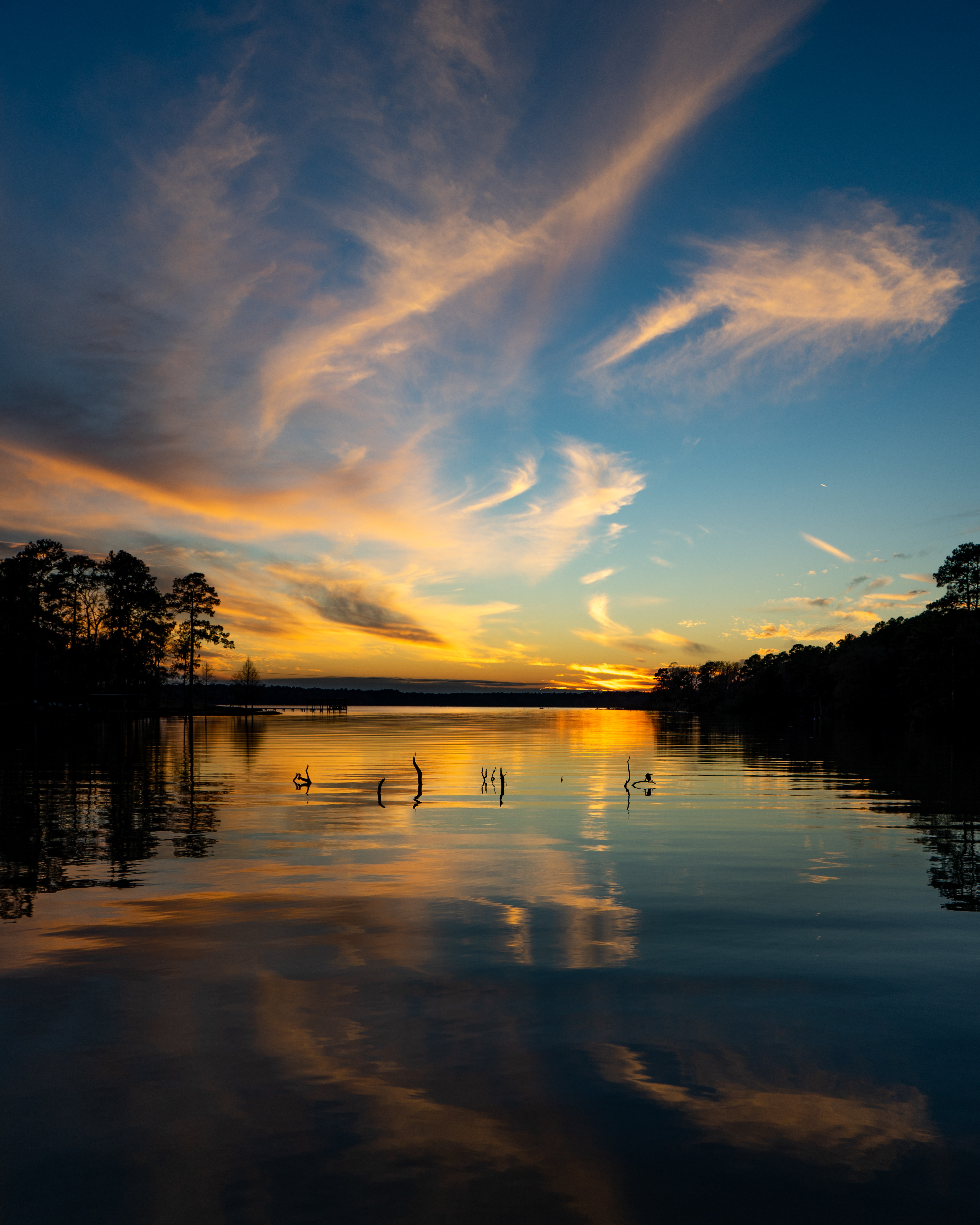 Winter Sunset over Lake Livingston, in eastern Texas. The reflections of the clouds in the water kinda look like manatees to me. I love the way this image makes me feel. Thank you