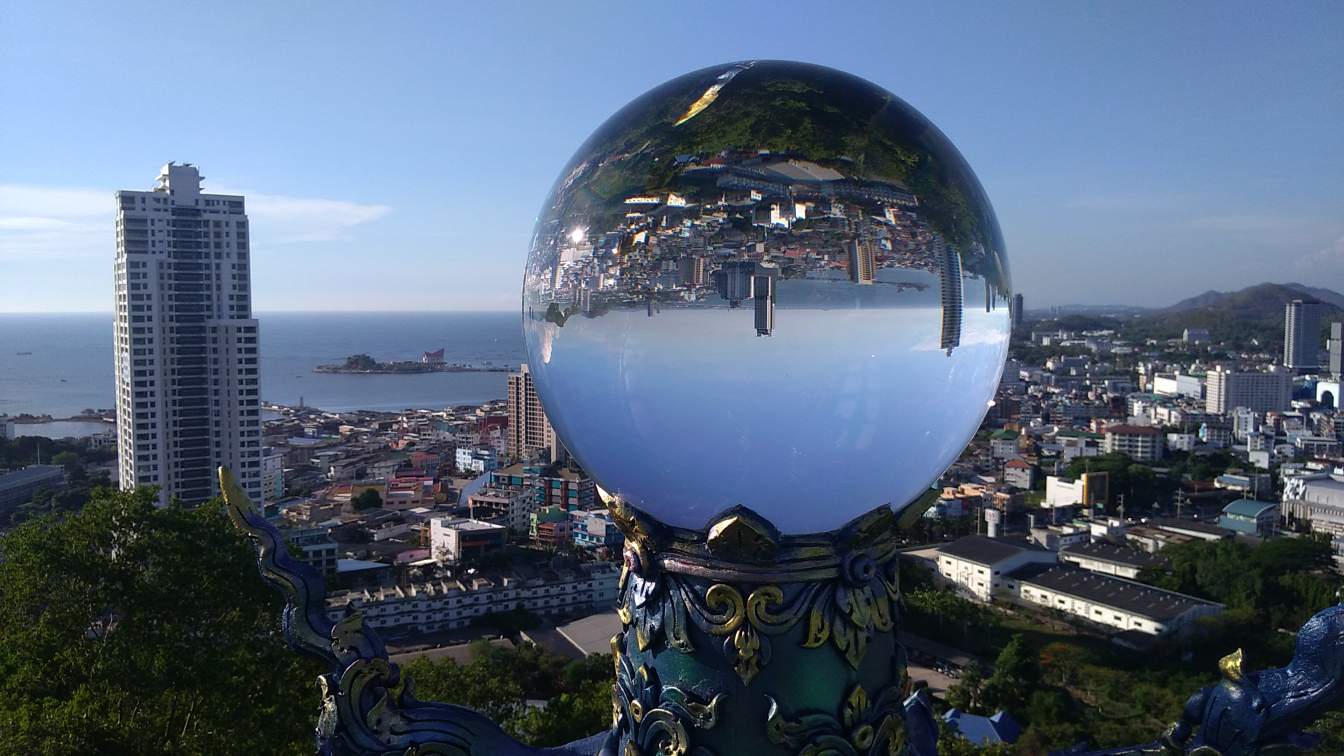this picture was taken by myself some hours ago. I visited a temple high above Sriracha, Thailand. A massive glass spheric mirrored the view, the first time I saw something amazing.