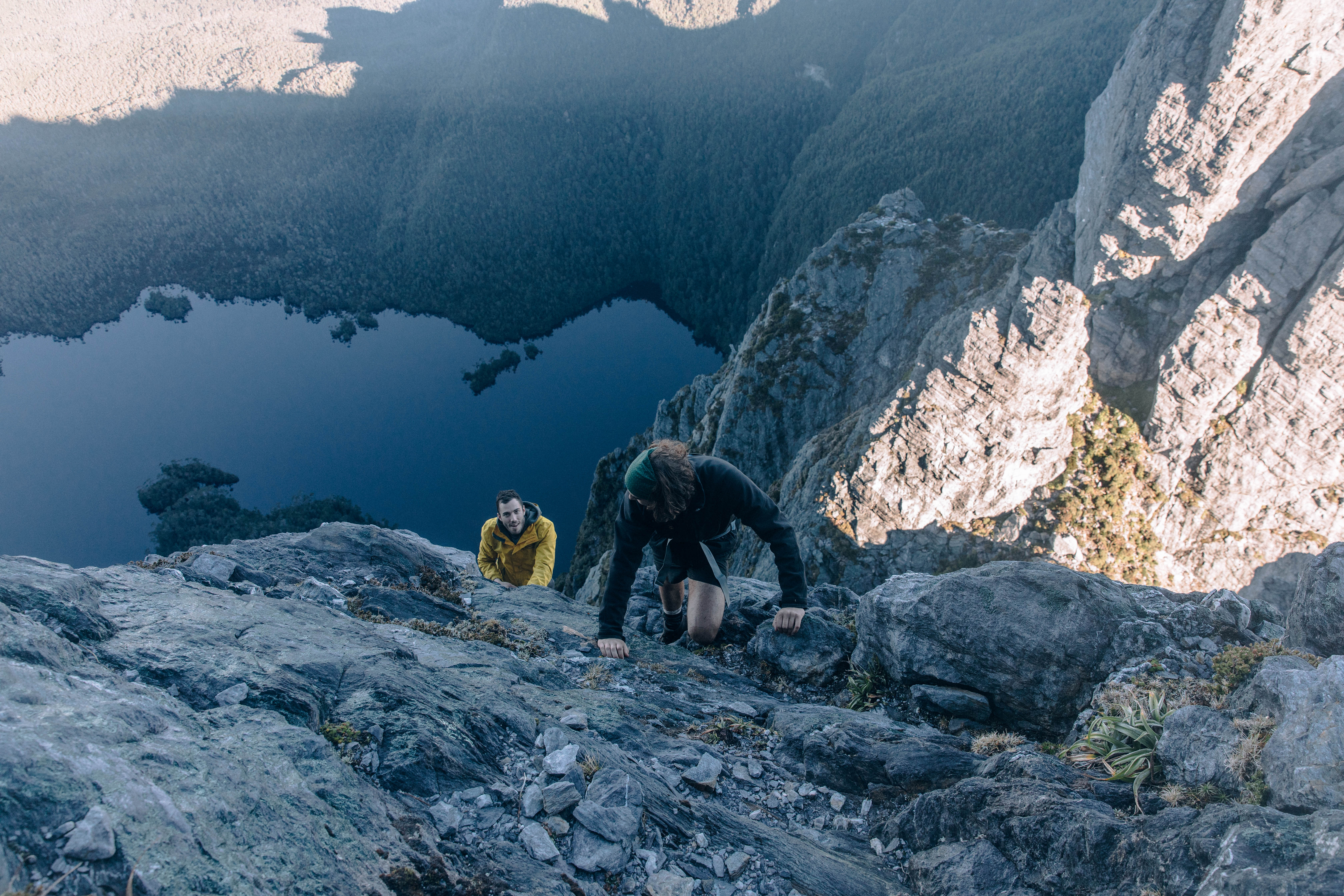 The scary climb with over a 600m drop down to the lake below