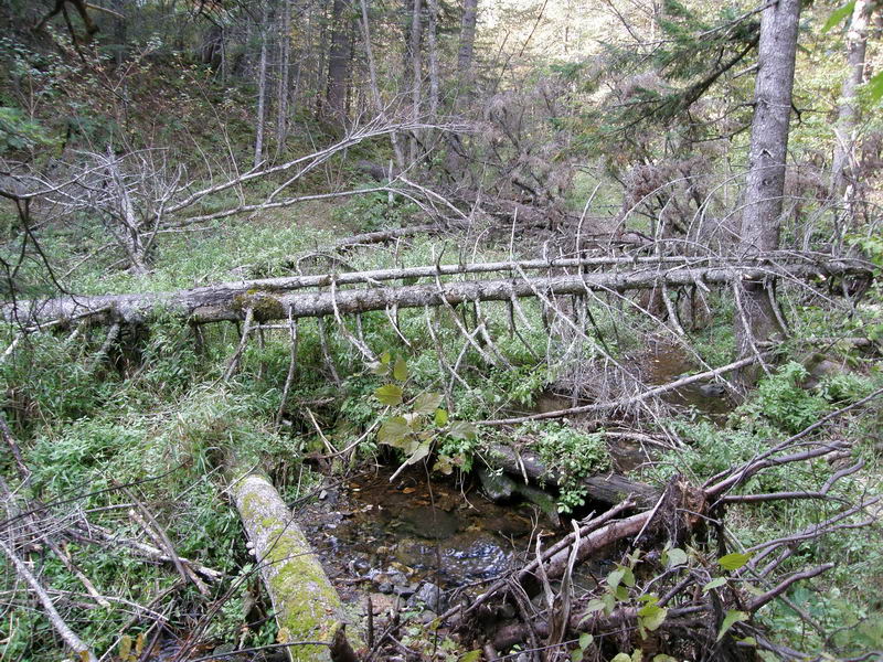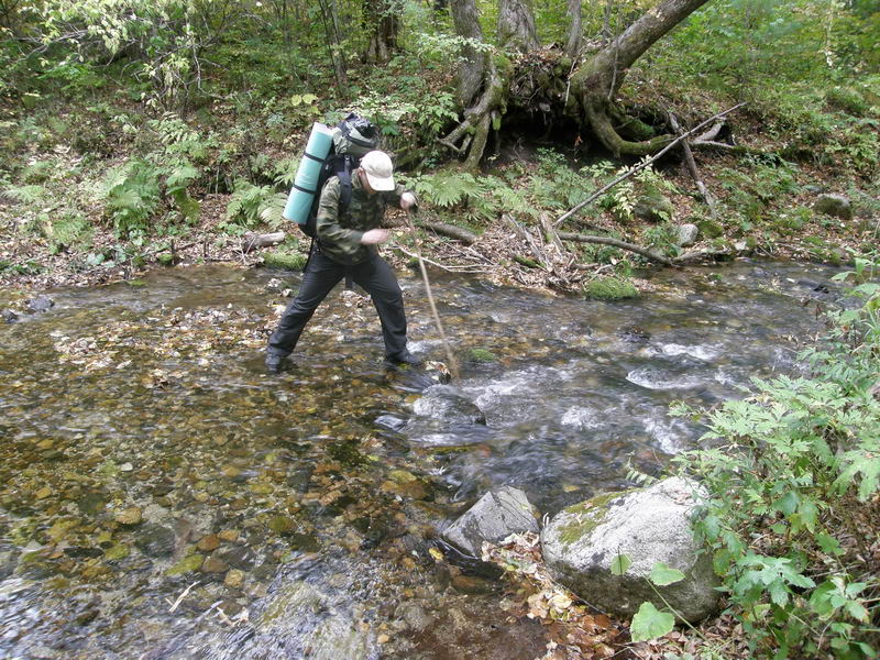 Day 3: In the morning, ice was discovered in a bowler. You are waiting for the sunrise like a native, to keep warm at least a little under its autumn rays. The sun crawled out lazily from behind the hills. Visibility is excellent. We walked along the Dragons, the photos made a lot. Before climbing to the village of Gorelaya they found a spring. We replenished water supplies, stumbled upon berry-growers, who, having learned that we weren’t picking berries or even rooting, were very surprised. The ascent to Gorelyu city turned out to be gentle and we easily overcame it. After looking around and leaving a note on the top of the hill, we started the descent towards the Kamensky stream, and immediately fell into a huge dead wood. We went down to the water and made a halt near the potbelly stove. The stove is like a stove, nothing surprising stands in the middle of the taiga.