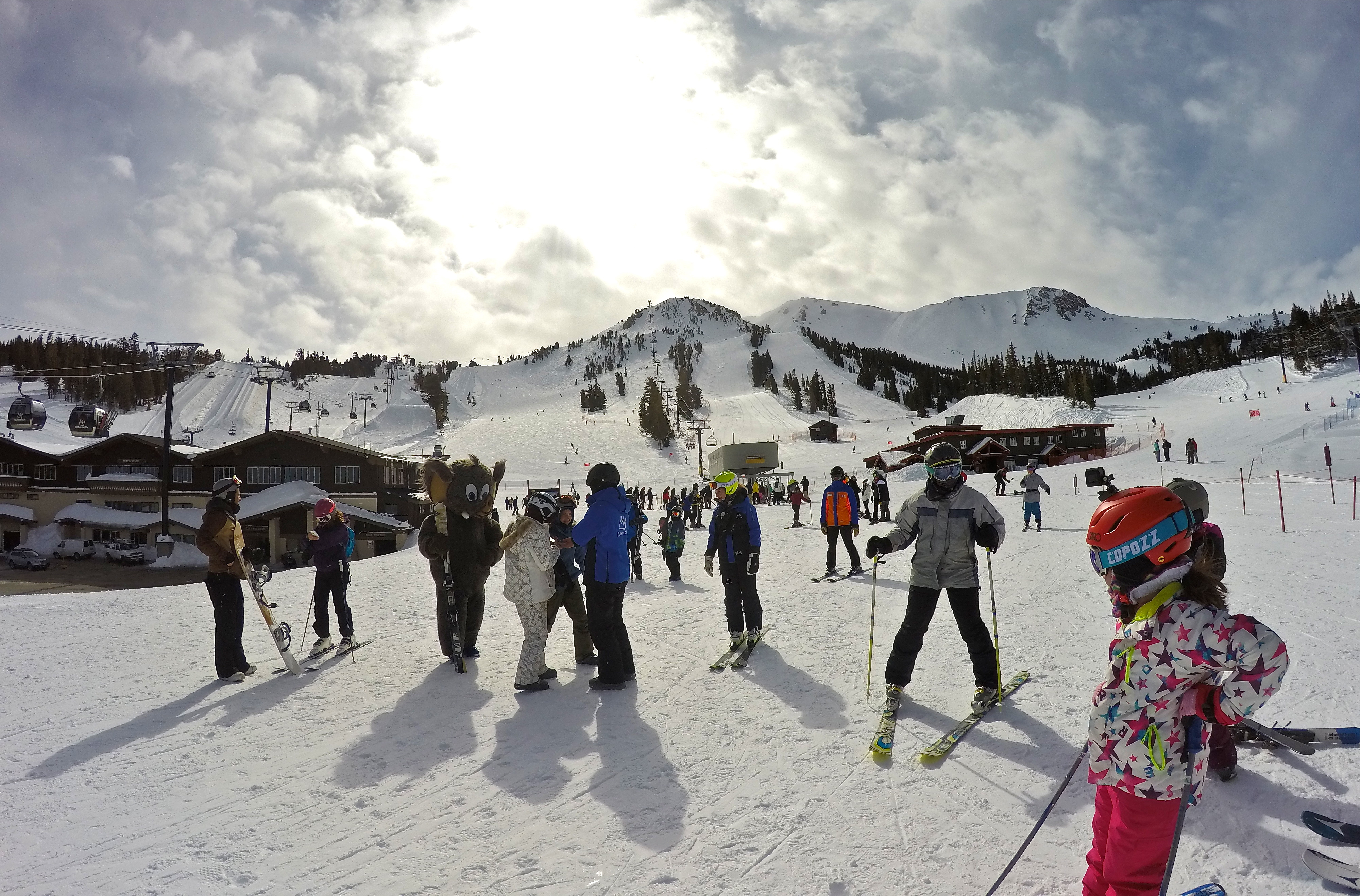 Mom skiing into the bottom at Main Lodge where Woolly, the skiing mascot, is there greeting kids!
