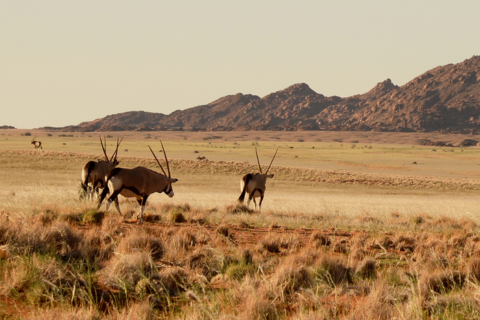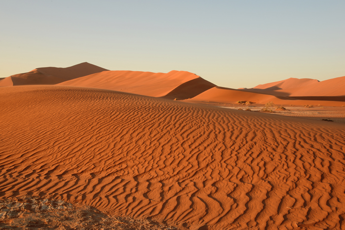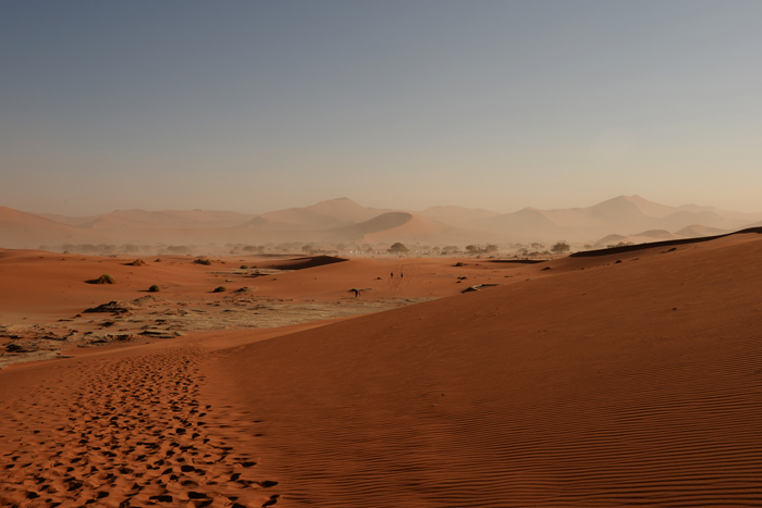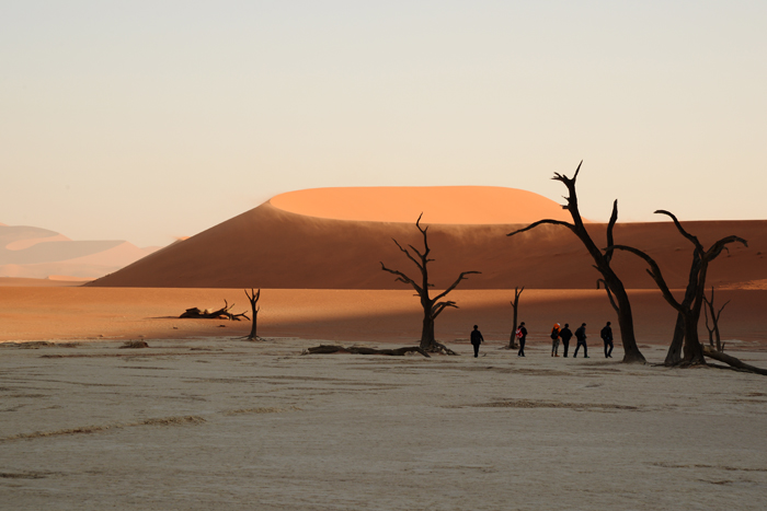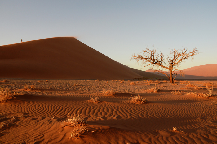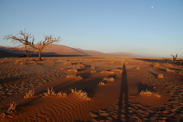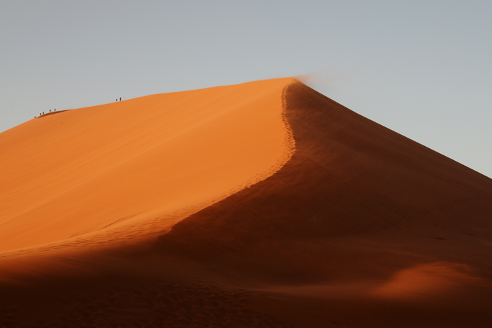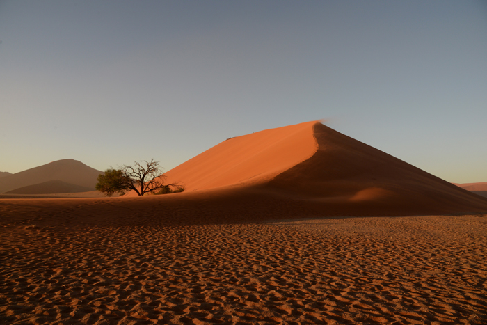 Dune 45 is perhaps the easiest of these giants to climb. Acording to our guide, this dune got it's name because it is located 45 kilometers on the paved road from Sesriem. It is a «star dune» - created when wind is coming from all dircetions. Seen from above they resembles a star, hence the name. It rises more than 150 meters above the surrounding plain, which makes it look like a giant when standing in front of it. The colors just after sunrise are simply incredible.