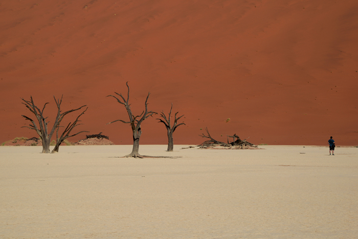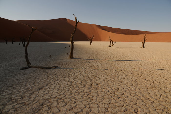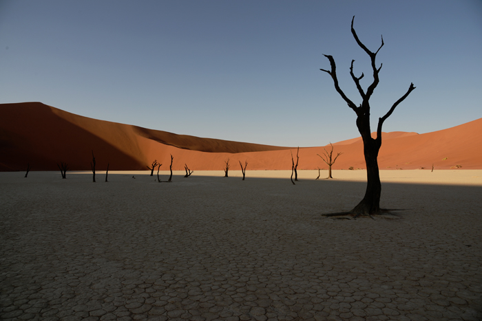 Arriving at the pan, the sunlight had just started it's play, creating stark contrasts between light and shadow across this ancient landscape. An absolutely surreal experience and great photographic opportunities. Deadvlei is the remains of an ancient former river route. A circular depression that has been filled with water and surrounded by massive sand dunes that stretches all the way to the coast. The floor is white, consisting of dry, cracked mud and petrified camel thorn trees stretching towards the sky. Acording to the guide, the dead trees are more than 500 years old. They have become fossils, still standing as sihouettes against the dunes and the sky.