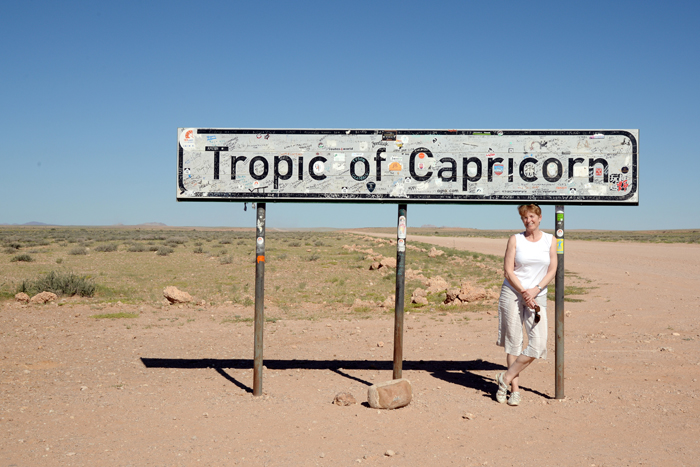 My roadtrip to Sossusvlei started an early morning in Valvis Bay. We were three friends travelling together with a driver and guide. It took almost a full day driving to Sesriem and our camp site. The road twists it's way through the Kuiseb and Gaub mountain passes. The landscape here is more rocky, but still desert country. Since it was a long drive, we had several stops on the way. One of the stops was at the Tropic of Capricorn. It is only a sign which marks this invisible line. But still, Tropic of Capricorn is one of the five major circles of latitude and the southernmost latitude where the sun can shine from directly overhead. So a selfie was required!