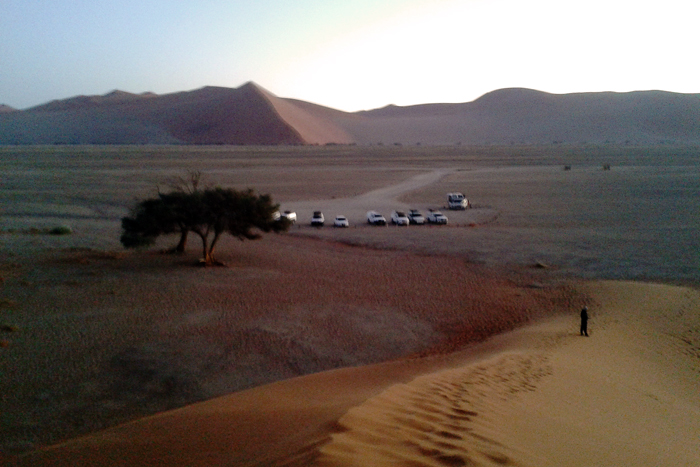 It had to be an early night since we were to get up at 04.30 to start the drive to reach Dune 45 before sunrise. During the night a strong wind had developed. I woke up when I felt sand on my sleeping bag! That made me put on my head light quickly to check what was going on. I allready had my own litle sand dune in my tent! The wind was shaking my tent. Felt as if it was going to be blown away. But I got help from the others to tie my tent to a tree!