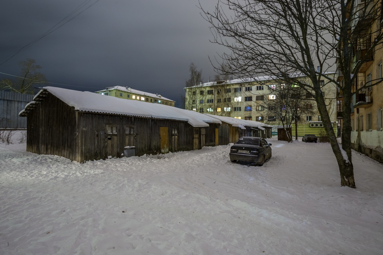 For example, this is a long two-story barn across from the usual five-story apartment building.