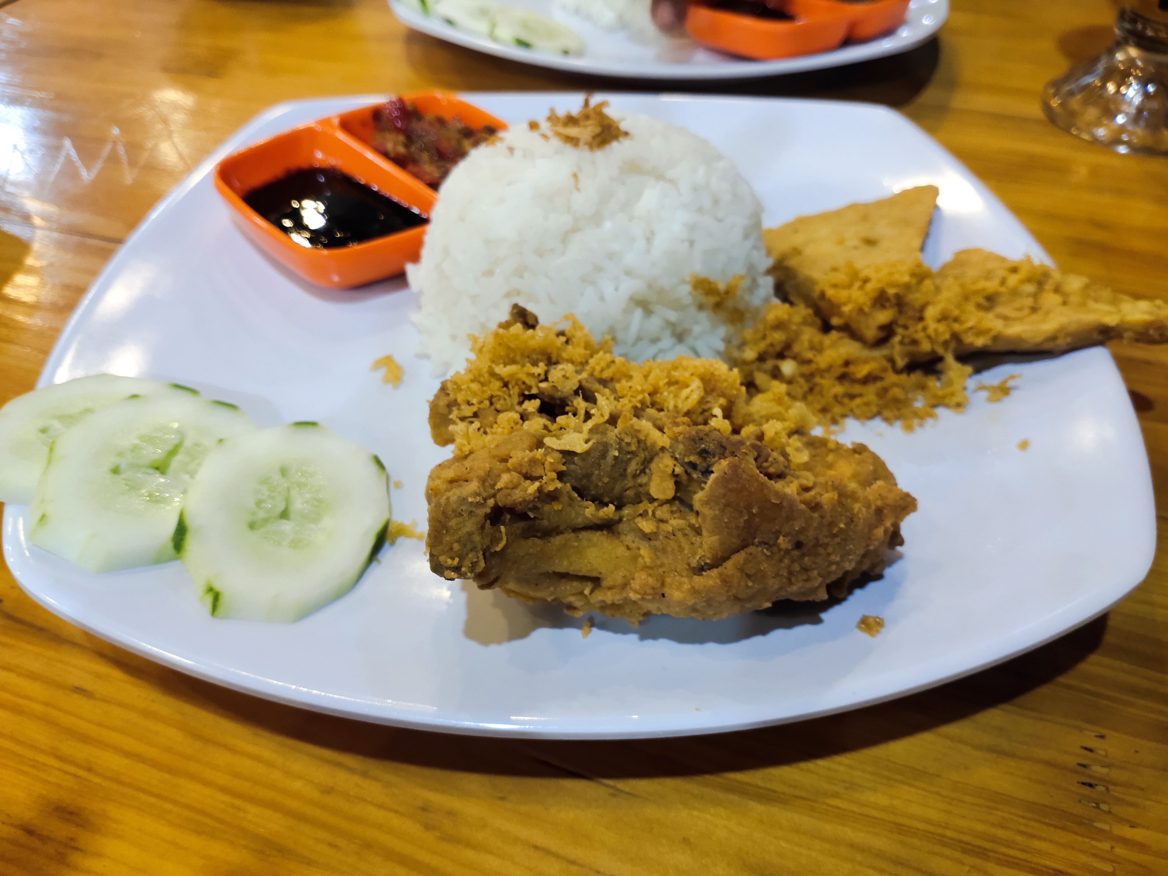 Geprek chicken menu includes 1 piece of chicken, soy sauce, vegetables, tempeh and rice. to drink myself ordered cold lemon tea. the atmosphere of the seating here is also very comfortable to be used as a hangout place. if you invite my family, it is a comfortable home because here the place is very comfortable and quiet.