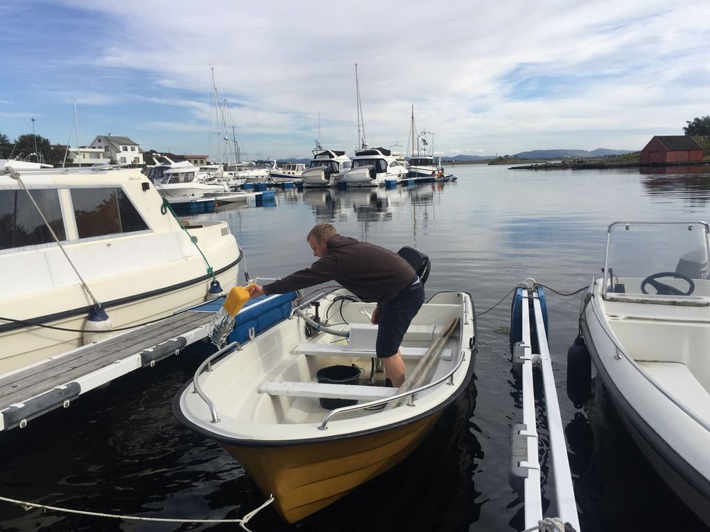 First you need a boat. In Norway it rains a lot, and when you get to the boat you usually have to "aus" it for water as its called in Norwegian. Here you can see my friend Knut doing the traditional "ausing" of the water.