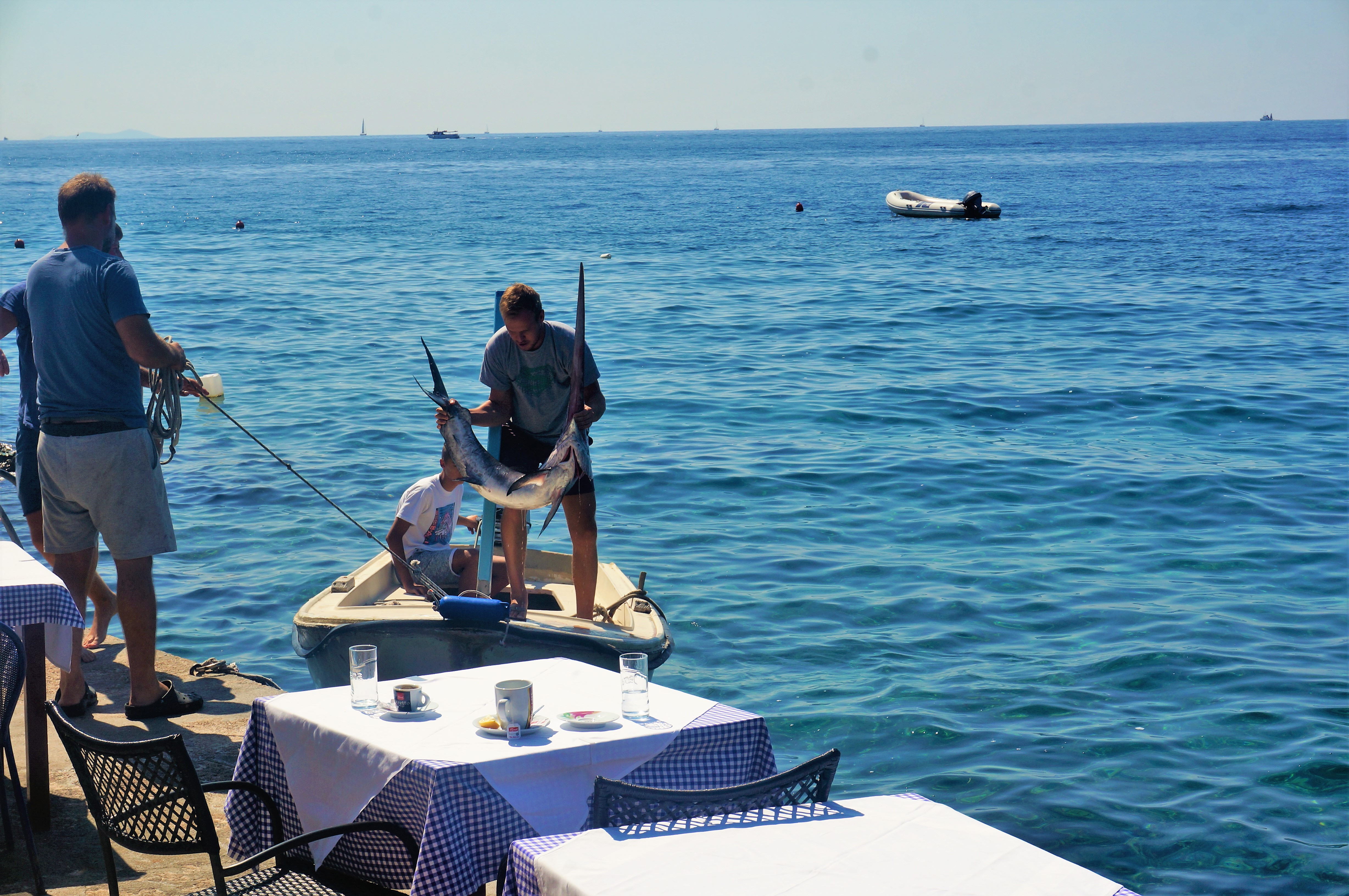 This is how fresh the sea food was. We watched the sword fish being taken off the boat while we ate, and taken up to the restaurant. When I went to the toilet before getting back on our boat, after lunch, they sword fish was being cut up and displayed in a chiller cabinet in the front of the restaurant, ready to be eaten by their next visitors! Can you imagine having fish that was that fresh? We need more of that around where I live!
