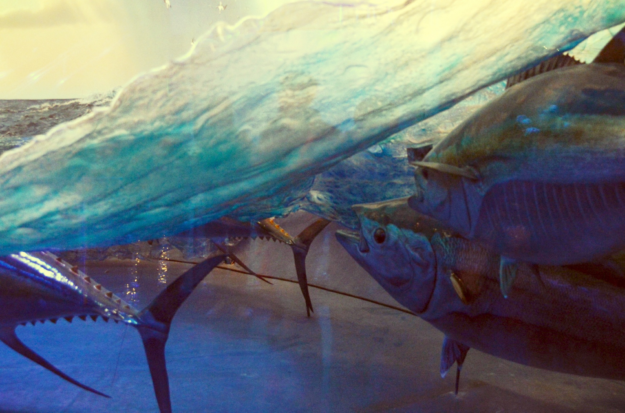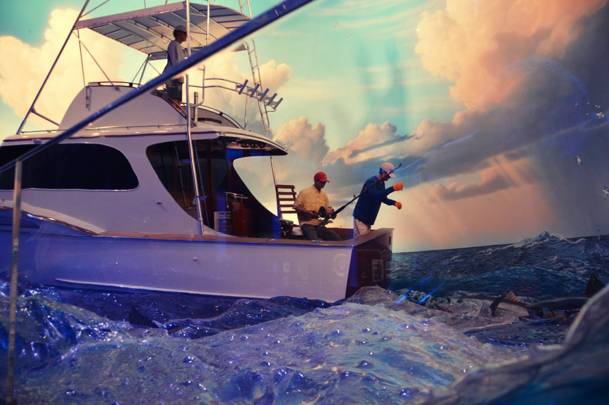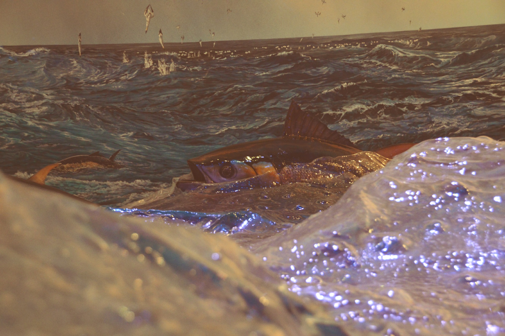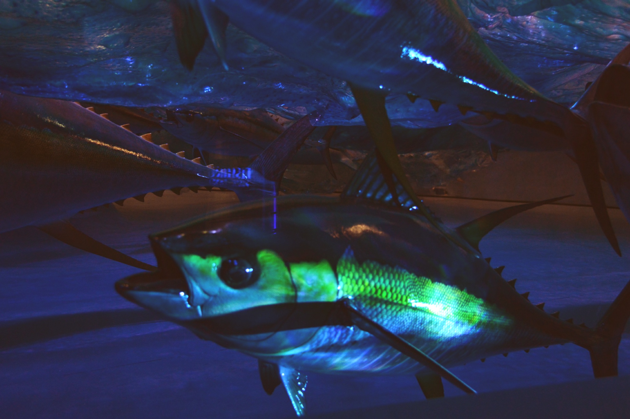 After the room with the bait ball, we came to a room full of different types of tuna mounted on the wall. In front of us was a huge diorama of a fishing vessel and a school of yellow-fin tuna.