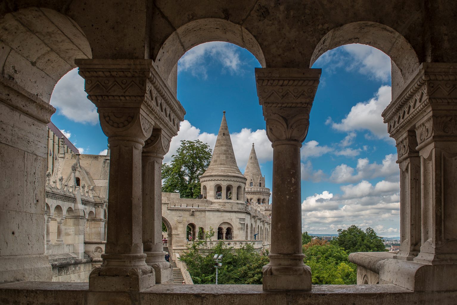 The Fishermen's Bastion (Hungarian: Halászbástya) is a neo-Romanesque monument built by Frigyes Schulek between 1895 and 1902 in the Hungarian capital Budapest. It rises on the castle hill at the place of the medieval fish market of Buda. The name comes from a fishing guild for which the monument was erected. This guild had to defend this part of the city wall in the Middle Ages. The bizarre building, with its conical towers reminiscent of the Magyars' tents, is used as a panoramic terrace on the Danube and Pest.