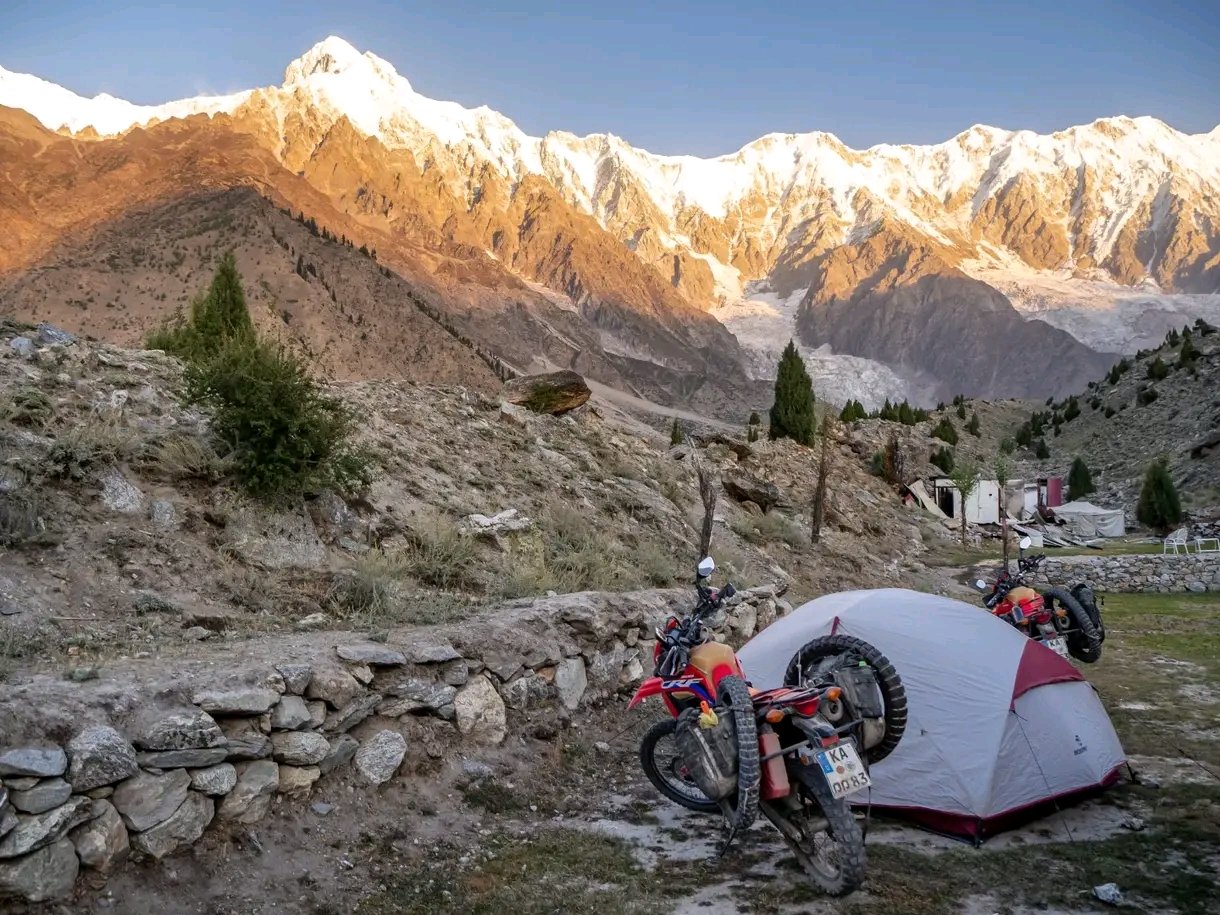 The road to Tarashing isn't exactly one would call a good road. It's a small dirt road, often washed out and damaged and, even if you're riding your own motorcycles like we do, it needs quite some time to reach this remote place. The last proper village in the lush Rupal Valley greeted us with green potato fields, apple orchards, and curious locals who raised eyebrows at our dusty bikes. We set up camp there right above the massive Taraching glacier and stayed for two glorious nights. Perfect for resting the bikes, soaking in the views, and mentally preparing for what was coming.
