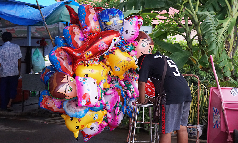 This picture shows the entrance of Phanthai norasing floating market. In front of the market has the balloon market woman that waiting to selling the balloons for the children.