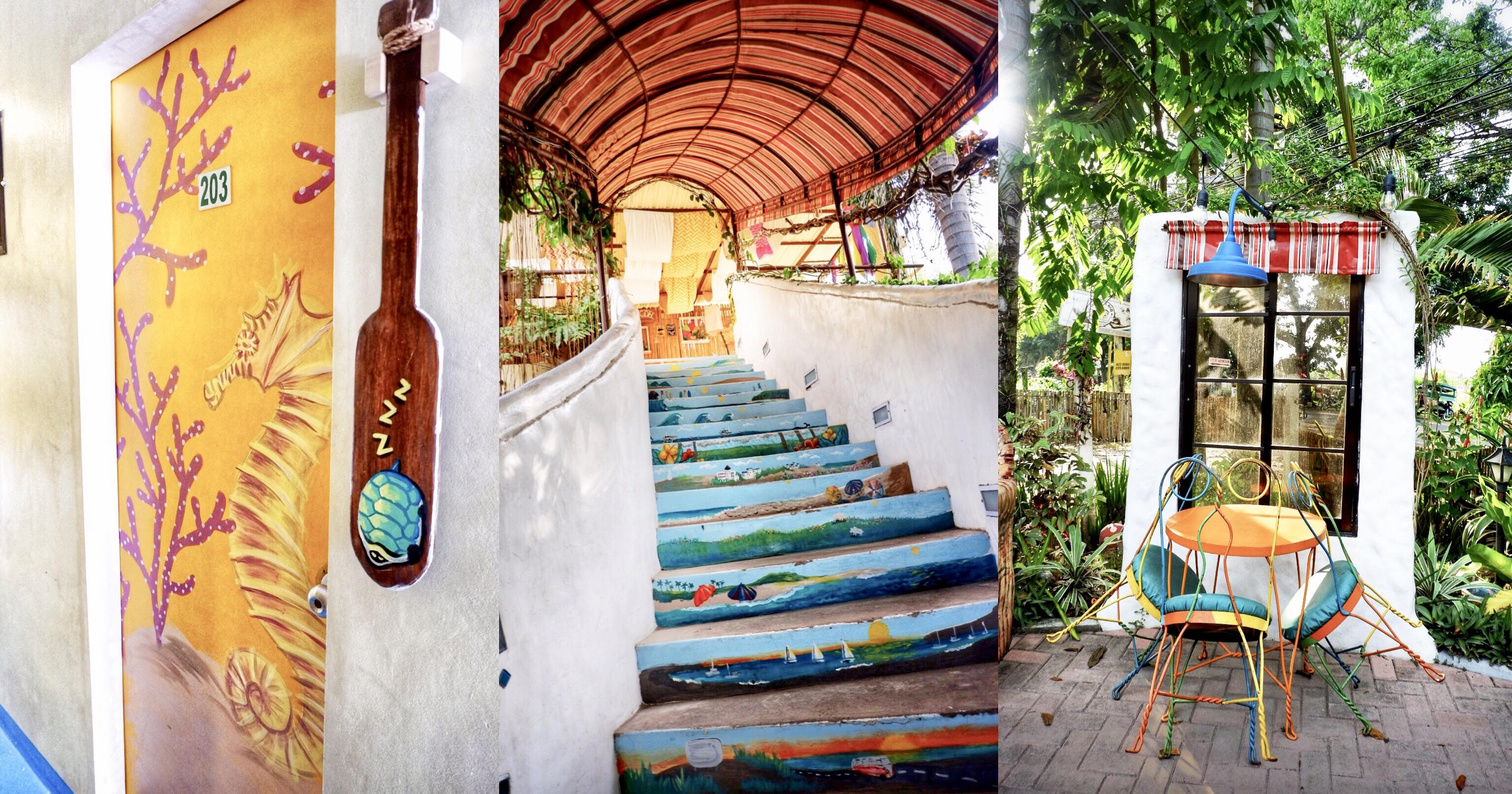 And look! It's so cool right? Even the doors of their place is so colorful, painted an underwater theme and we got a seahorse painting on the door, so lively. The steps on the stairs also have this beach theme, drawings of boats, fish , corals and beaches, various colors you can see, a shade above when you walk through your rooms and on the third picture I took this outside the restaurant on our way to our room, seeing this was a perfect style for a restaurant to have, so catchy to the eyes and you would want to sit there, just a small single wall standing with a single window and a lamp on top with a table and chairs with colors, so nice.