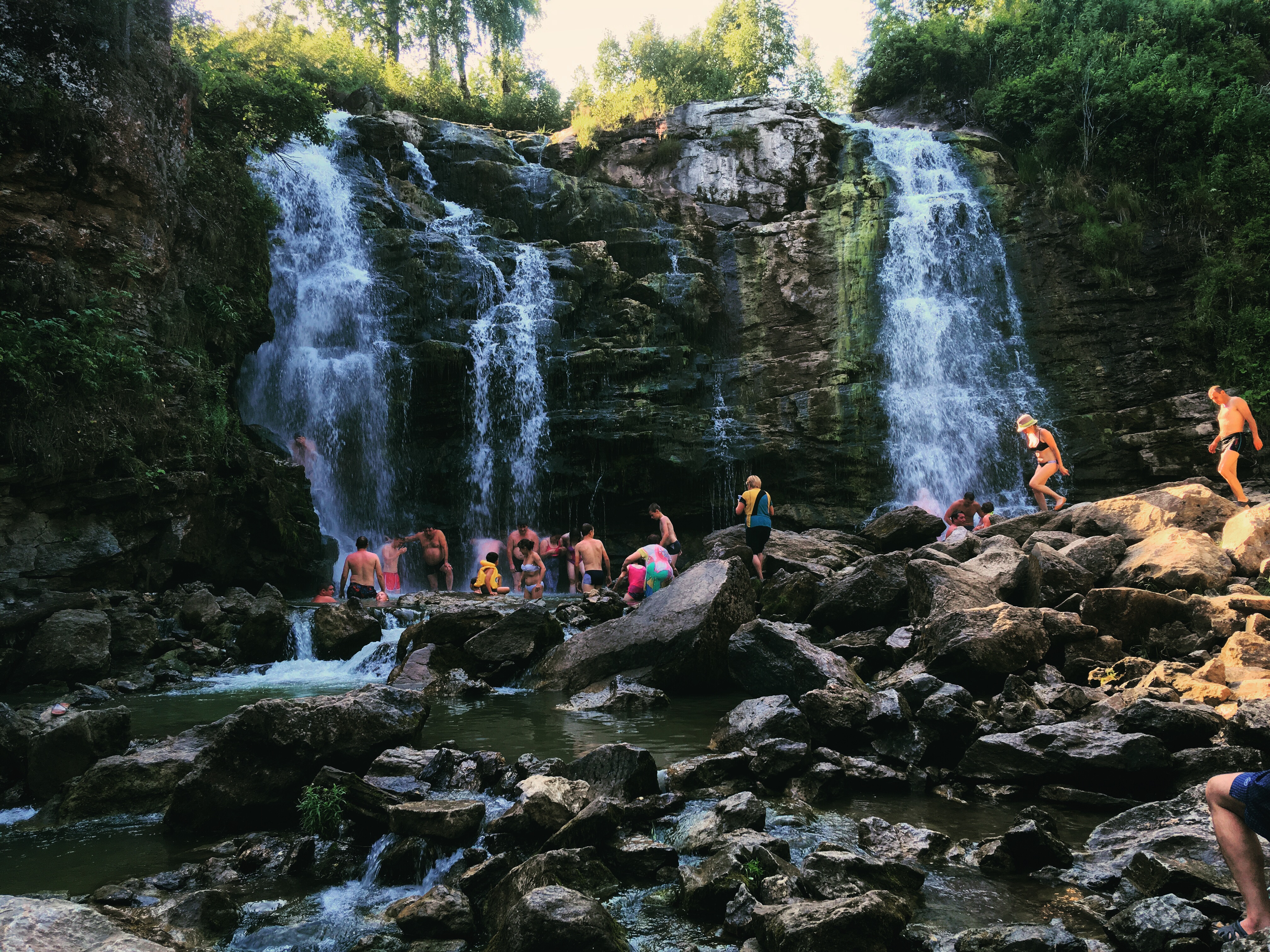 Since the base turned out to be much earlier than we thought, the path to the waterfall was not close, and we walked for a long time. But when arrived at the place, we were very happy, because in front of us was a large lake, the water in which was warmer than in urban reservoirs, and we wanted to swim like that. But first, until we were completely wet, we went to look at the waterfall and hold a small photo shoot there. Unfortunately, there were so many people below that we couldn’t get through, so we had to shoot only at the top.