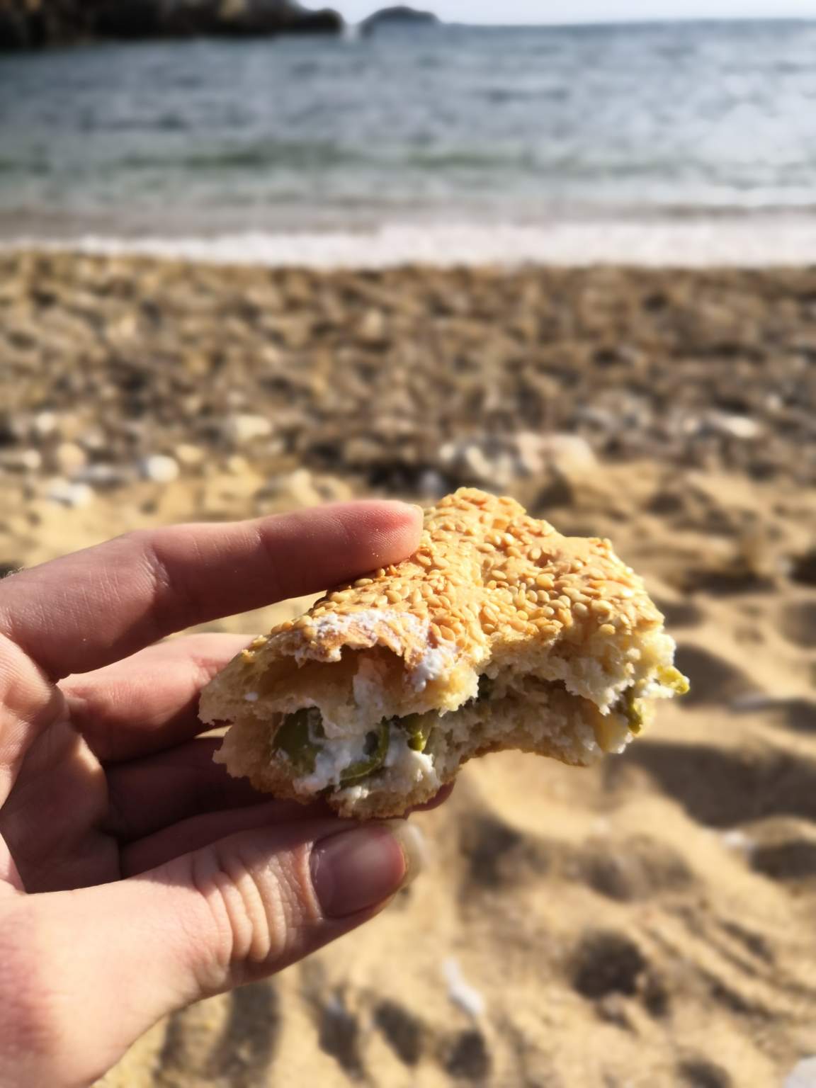 We just stayed to picnic at the beach with special delicatessens. This day here in Greece we eat a kind of bread which is called "lagana" which can be filled with anything you like ( taramas, olives, honey).